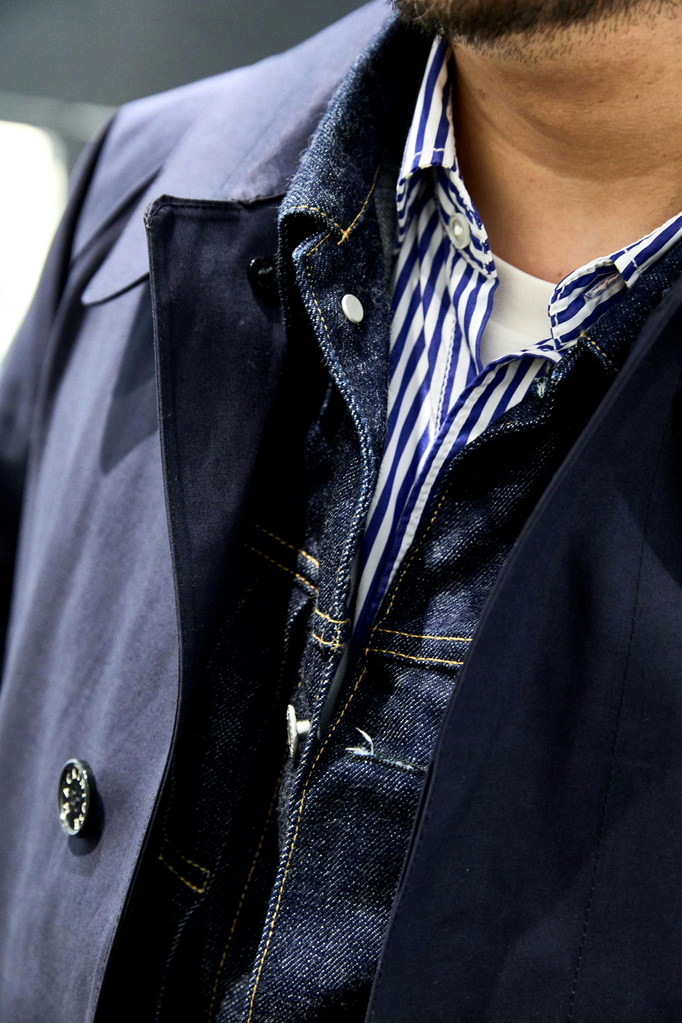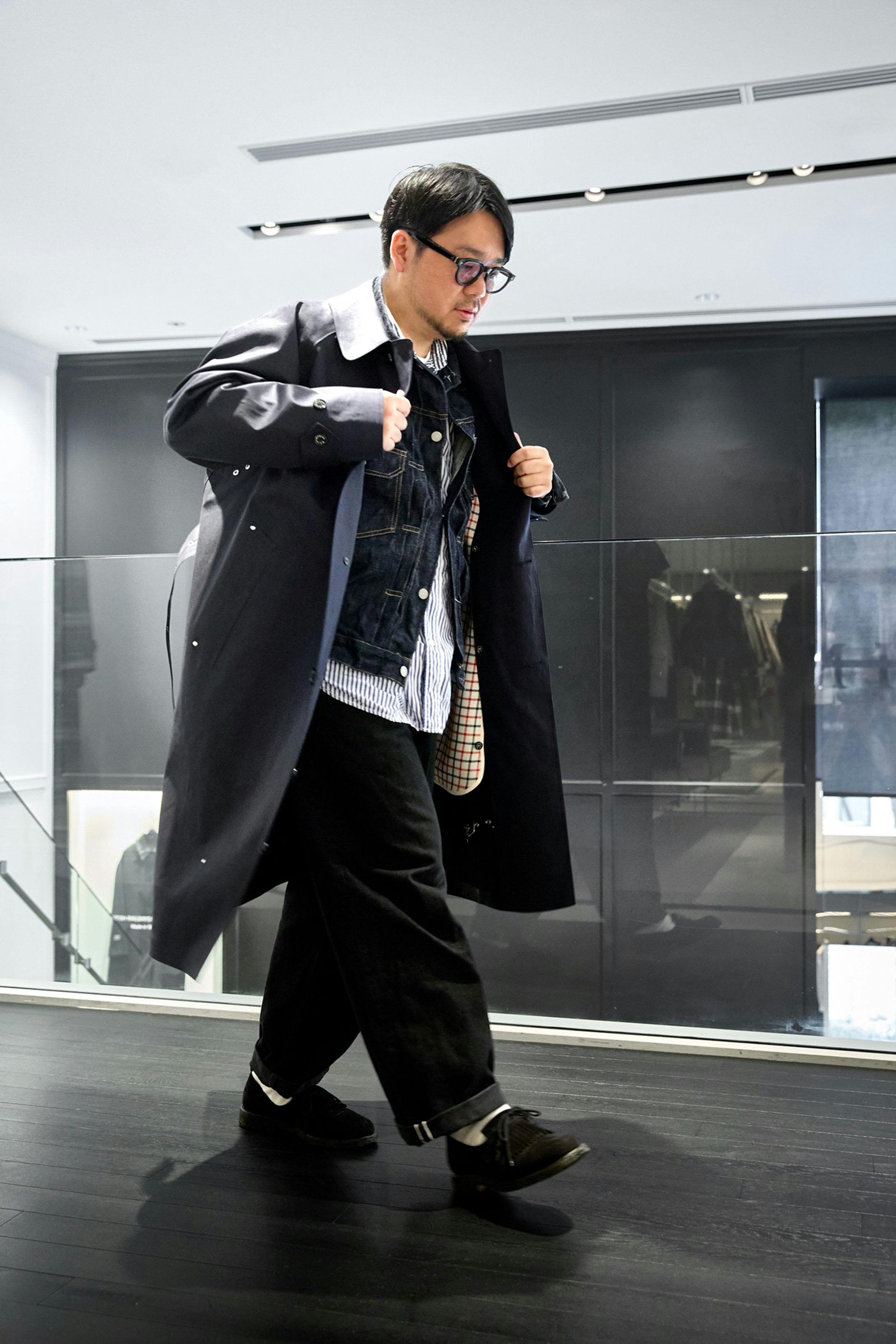 コートのゆとりあるサイズ感から、デニムジャケットをインに挿したレイヤードスタイルを試みてみた。洗いざらしのストライプシャツもブルーを選ぶことで、ガチャついた印象にならないよう調整している。また、このコートの持つ柔らかな雰囲気を生かすべく、パンツもわずかにテーパーの効いたワイドな一本にした。おおよそ春秋の僕のいつものスタイルなのだが、乗馬に由来するディテールが、このコートを羽織る僕の気持ちを少し高揚させてくれる。