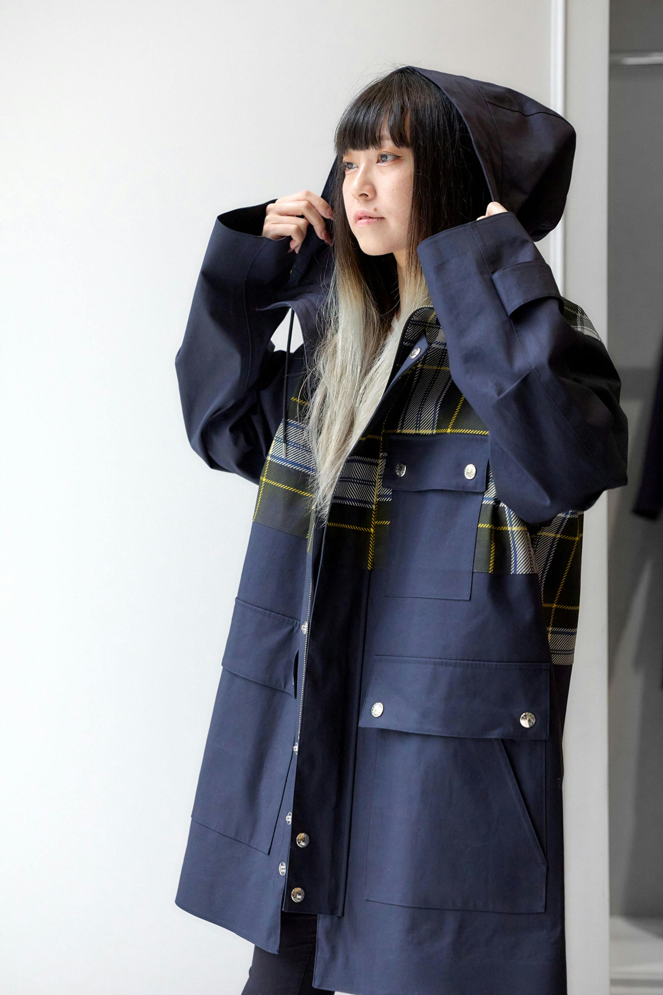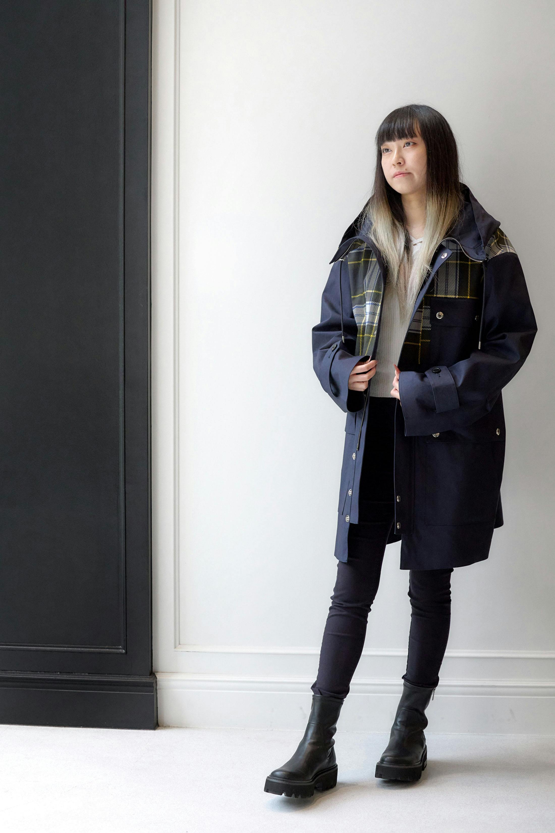 マッキントッシュというと端正なコートのイメージが強かったが、石川さんに選んでもらったジョンストンブリッジは、いい意味で少し印象が違った。ネイビーをベースにした落ち着いた色味に肩まわりのチェックが効いていて、きれいにまとまりすぎない。見た目にはしっかり存在感がある一方で、実際に着ると重たく見えず、普段の自分の服装にも自然になじんだ。フィールドパーカーらしい雰囲気はありつつも街着としてまとめやすく、雨が降るか迷う日や、朝晩で気温差のある日にも選びやすいコートだと思う。私は黒をベースにした服を着ることが多いので、このくらいボリュームがありながら色数を増やしすぎないコートは取り入れやすいと感じた。