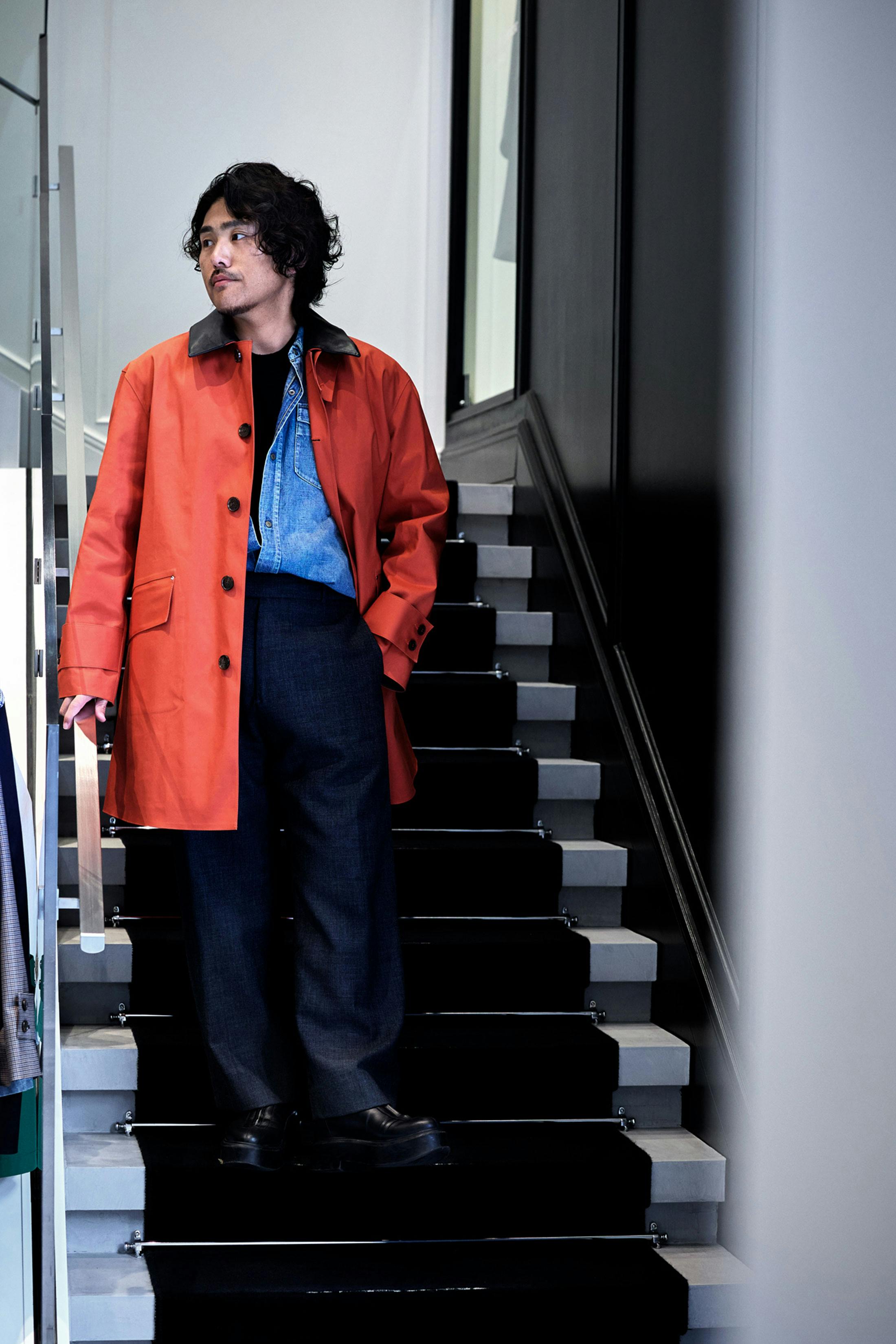 僕はこれまでに3、4着ほどのマッキントッシュを所有してきたが、いわゆる王道であるシングルタイプのステンカラーをセレクトしたことはなかった。コートに限らず、なるべく人と被りたくない天邪鬼としては、この鮮やかなオレンジのハンビーは珍しく、ワードローブに加えるという観点からもよい選択に思えた。ただ、こうした主張の強いアウターと合わせる場合、他のアイテムのトーンを抑えないとなかなかこなれない反面、コートだけが目立って面白みに欠けるコーディネートにもなりかねない。面白くもこなしの難しいアイテムを選んでくれたものだと思ったが、そうしたときには自分が一番着慣れているアイテムをまずチョイスすることにした。