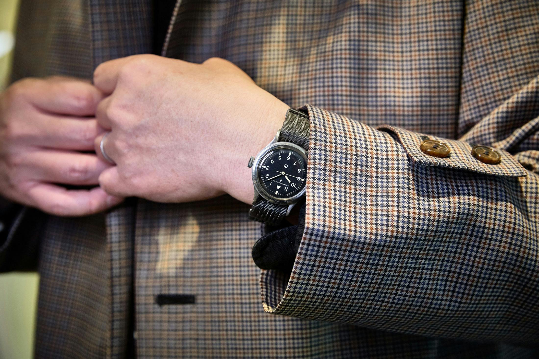 高い視認性、実用本位の設計、そして過剰な装飾を排した佇まい。マーク11は飾るためではなく、役割を果たすための時計だ。クラシックなコートにあえて合わせることで、そのストイックさや、無骨なニュアンスで自分のライフスタイルや好みを自然ににじませることができると思ったのだ。加えて、なぜその時計を選んだのか? という、出会う人との会話の糸口になるかもしれないという考えもあった。