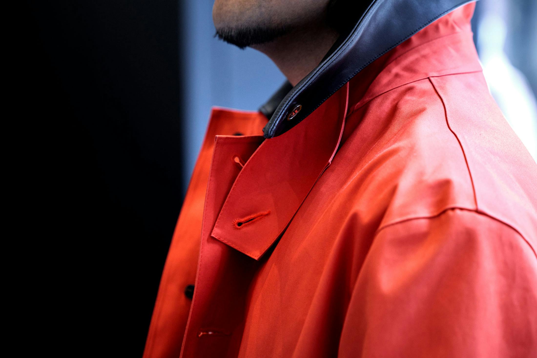 本企画の担当として、僕はスタイリストの石川さんとともにプレスルームでの見立てに立ち会った。部員それぞれの個性や好みに合わせ、石川さんの手によって次々とアイテムが選別されていくなか、僕に割り当てられたのがこのロックスバラというモデルだった。マッキントッシュと聞けば、まず端正なシングルブレストのダンケルドなどが脳裏をよぎるが、このロックスバラはゆったりとしたAラインを描き、現代的なオーバーサイズシルエットを特徴とする。既存モデルを振り返ると、ウールやアルパカといった柔和な質感のものが主流という印象を持っていたが、本作にはブランドにおいて伝統的なゴム引き素材が採用されていた。