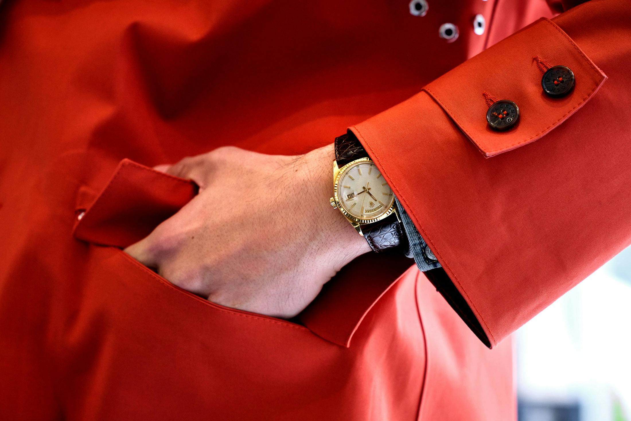 合わせた時計は最近購入した、ロレックス デイデイトのYGモデルで、1967年製かつ文字盤が退色した、通称“ゴースト”。こちらはリアルなヴィンテージ品だが、ヴィンテージを思わせる現行品、クラシックなブランドの最新作という、それぞれにギャップをもたせる意図でセレクトしてみた。現代的に解釈されたデニムシャツと、伝統を重んじながらポップで楽しげに仕立てられたマッキントッシュが相乗効果を生み、時計自体にもクラシックさとは異なる表情が見えるようだ。