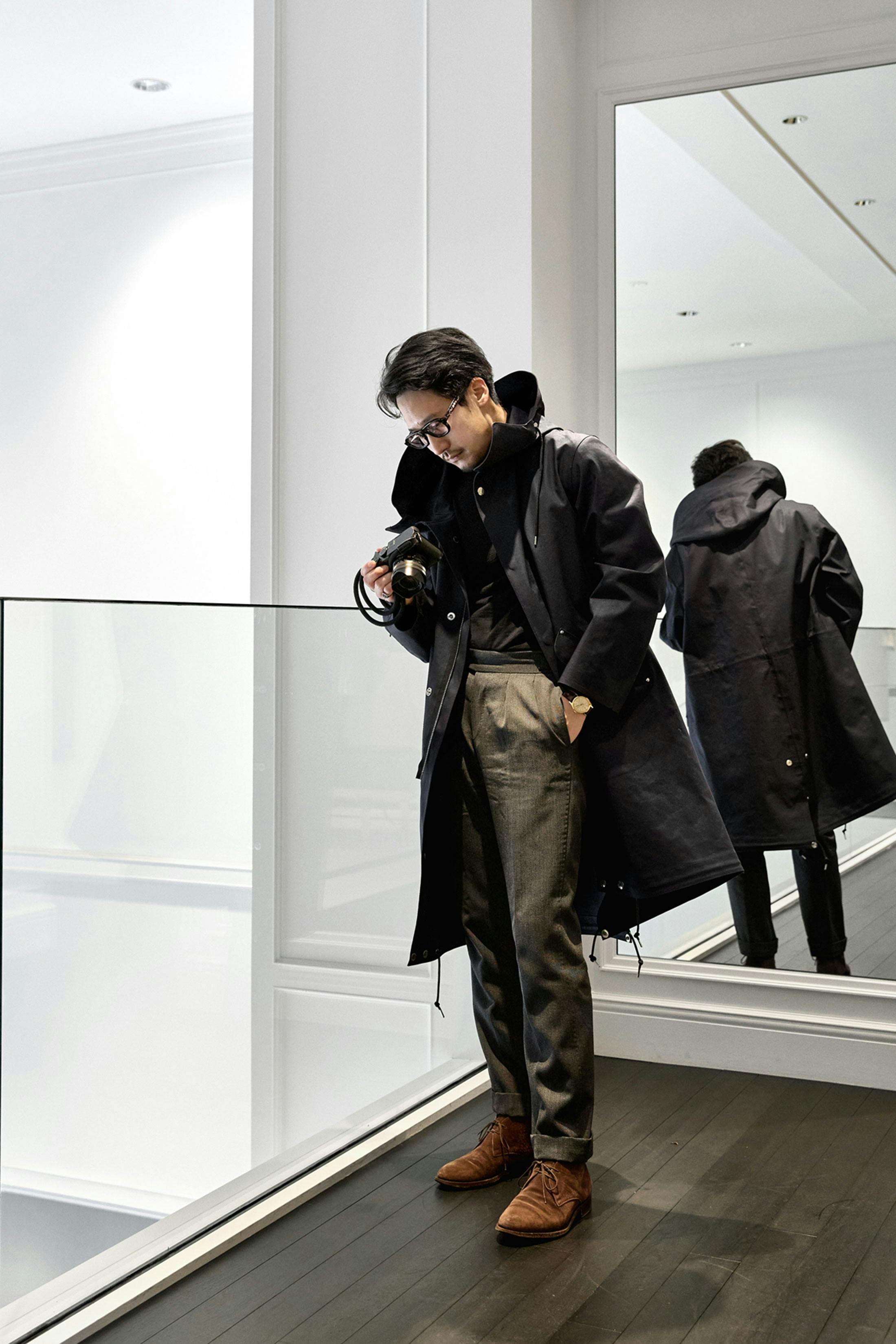 マッキントッシュのコートを着るのは今回が初めてでした。ゴム引きコートといえば高い防水性とクラシックな佇まいを思い浮かべますが、石川さんに選んでいただいたのは大きなフードが印象的な、どこかアクティブな空気をまとった一着です。伝統的でありながら、シルエットやディテールには現代的な軽快さがあり、いわゆる“守り”のアウターというよりも、外へ出かけたくなるような前向きなムードを感じました。少し雨が降る街に、防塵防滴のライカ Q2を持ってそのまま繰り出し、写真を撮り歩く——そんなシーンが自然とイメージできる点が、とても魅力的に映りました。