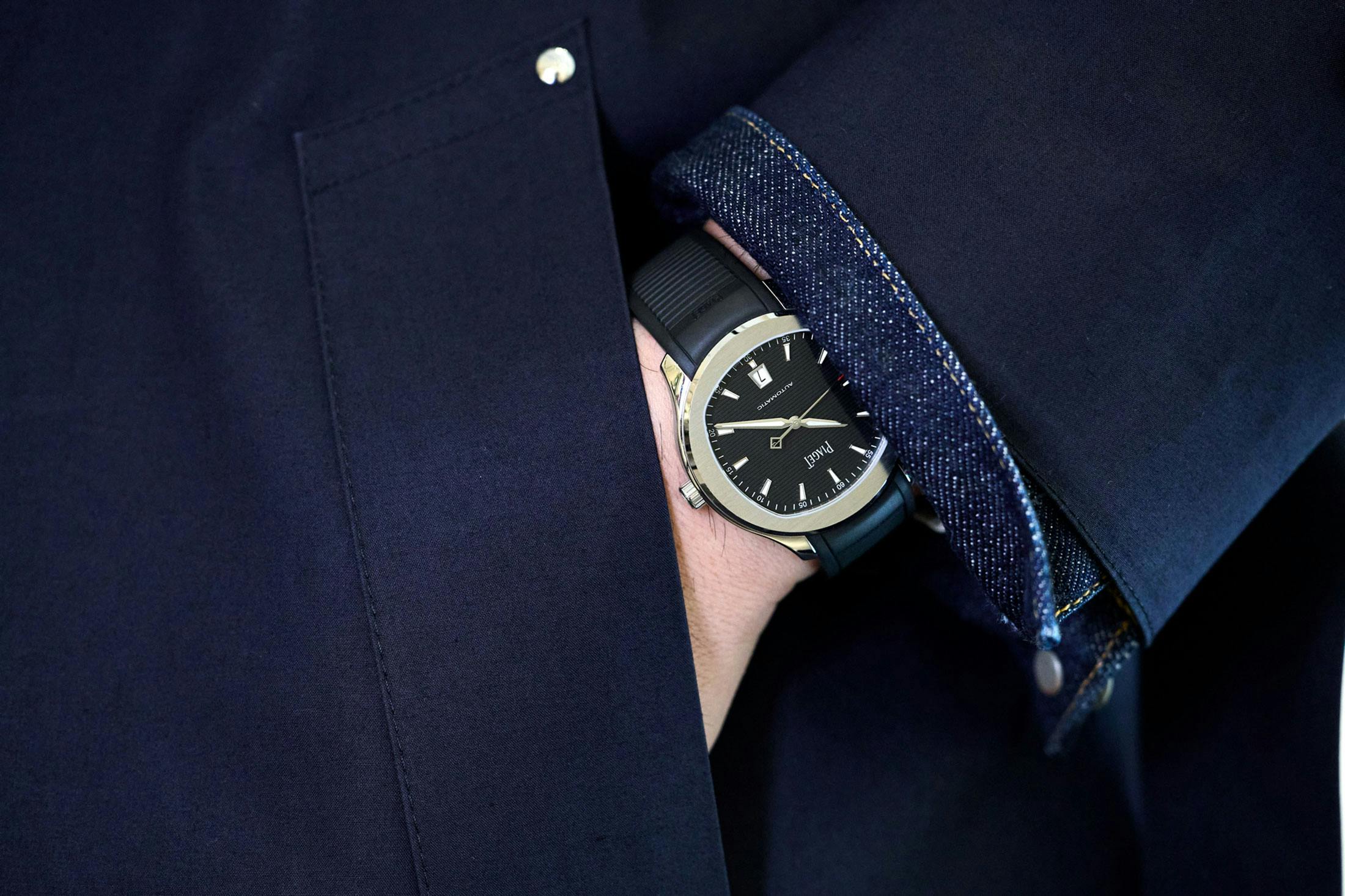 そこに合わせる時計には、その名のとおり貴族のスポーツ、ポロをイメージしたピアジェ ポロより3針のデイトモデルをセレクトしてみた。ピアジェ ポロもまた1970年代より続く歴史のあるモデルでありながら、本作ではシェイプ・イン・シェイプの42mm径ケースと水平方向に走るストライプが、モダンなスポーツテイストを醸す。パリッとハリのあるゴム引きのロックスバラとも、そのような点からリンクする時計である。ちなみに、ゴム引き素材に合わせてラバーストラップにしてみた。しかしどちらも、スポーツを出自に持ちながら、その背景をことさらに語りすぎないところに惹かれる。由来を知ればいっそう面白いが、見た目はあくまで端正で都会的。そのさじ加減が、この日の自分の着こなしにはしっくりきた。