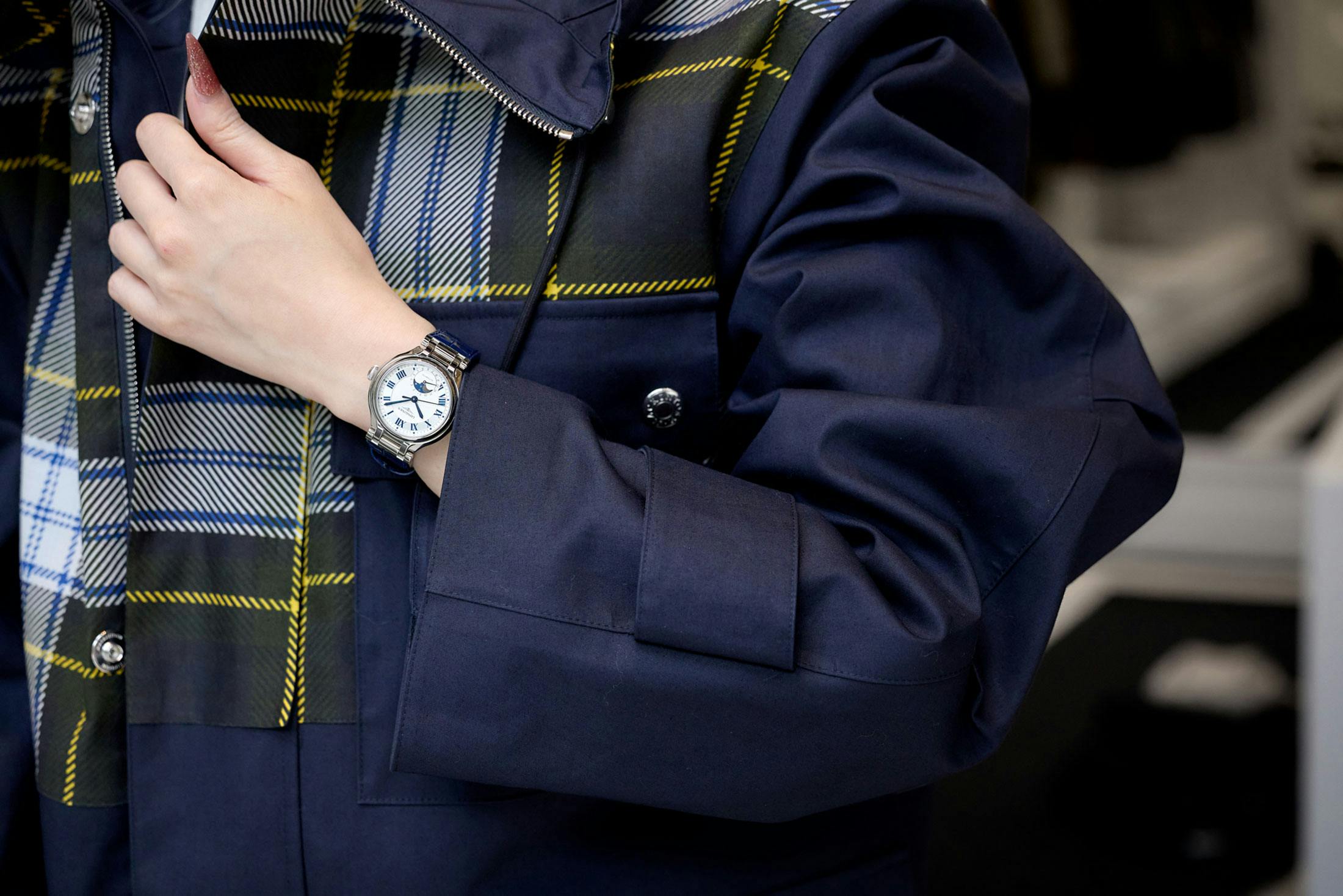 そこに合わせたのはロンジンのプリマルナである。こうしたコートにはスポーティな時計を合わせる選択肢もあると思うが、今回は少し違う方向に振りたかった。丸みのあるケースが手元をやわらかく見せてくれるし、ネイビーのストラップもコートの色と自然になじむ。フィールドパーカーの軽さを生かしながら、時計で少し品のよさを足せるバランスがちょうどよかった。