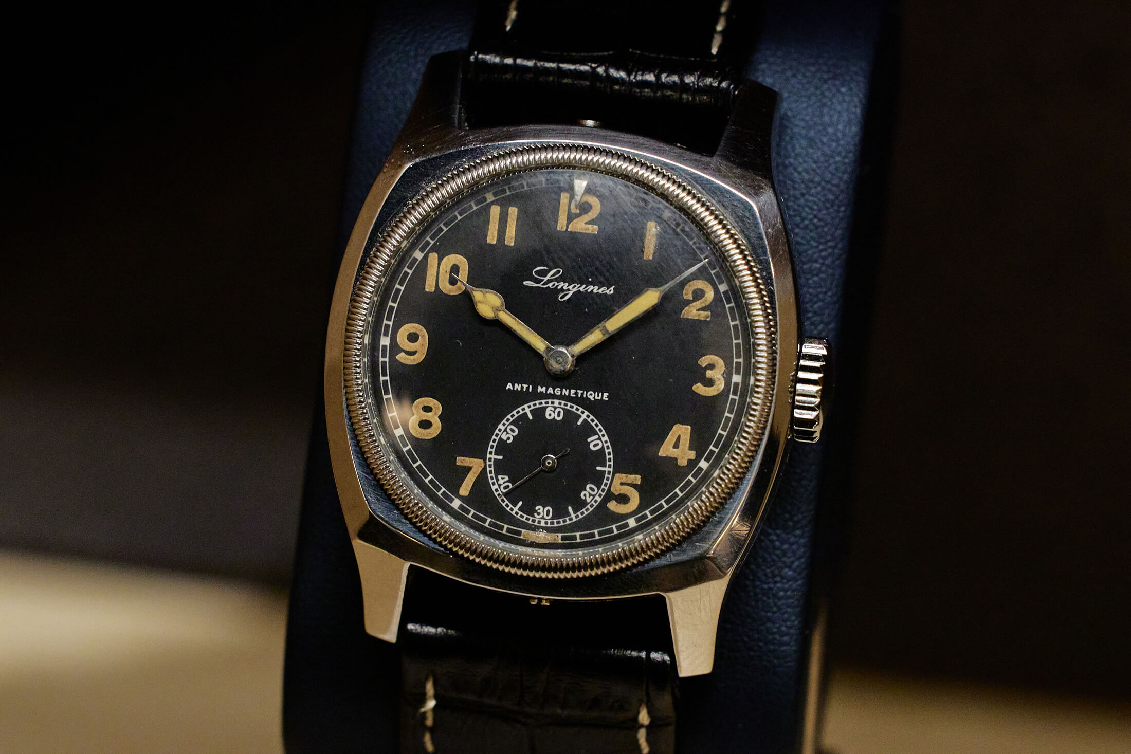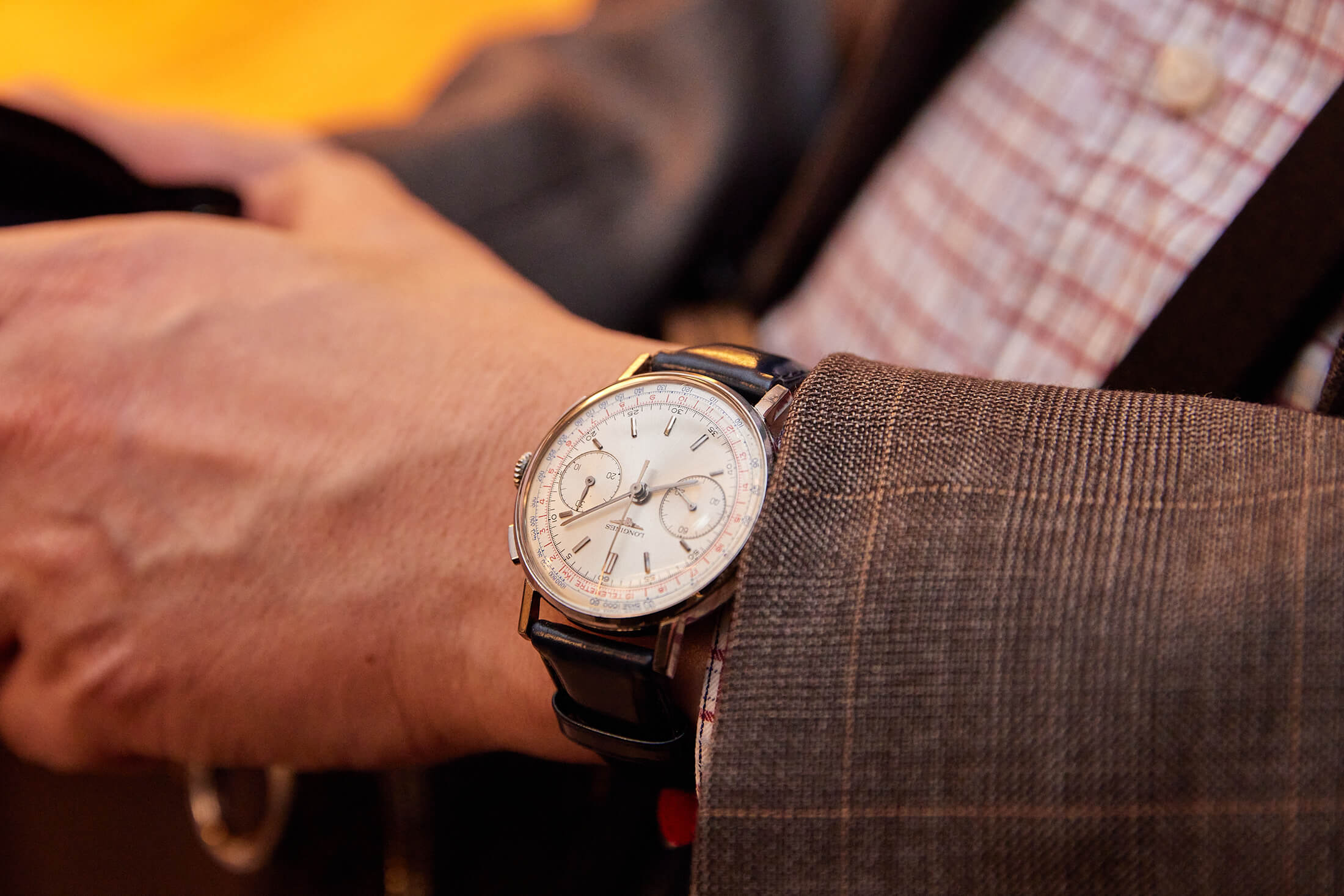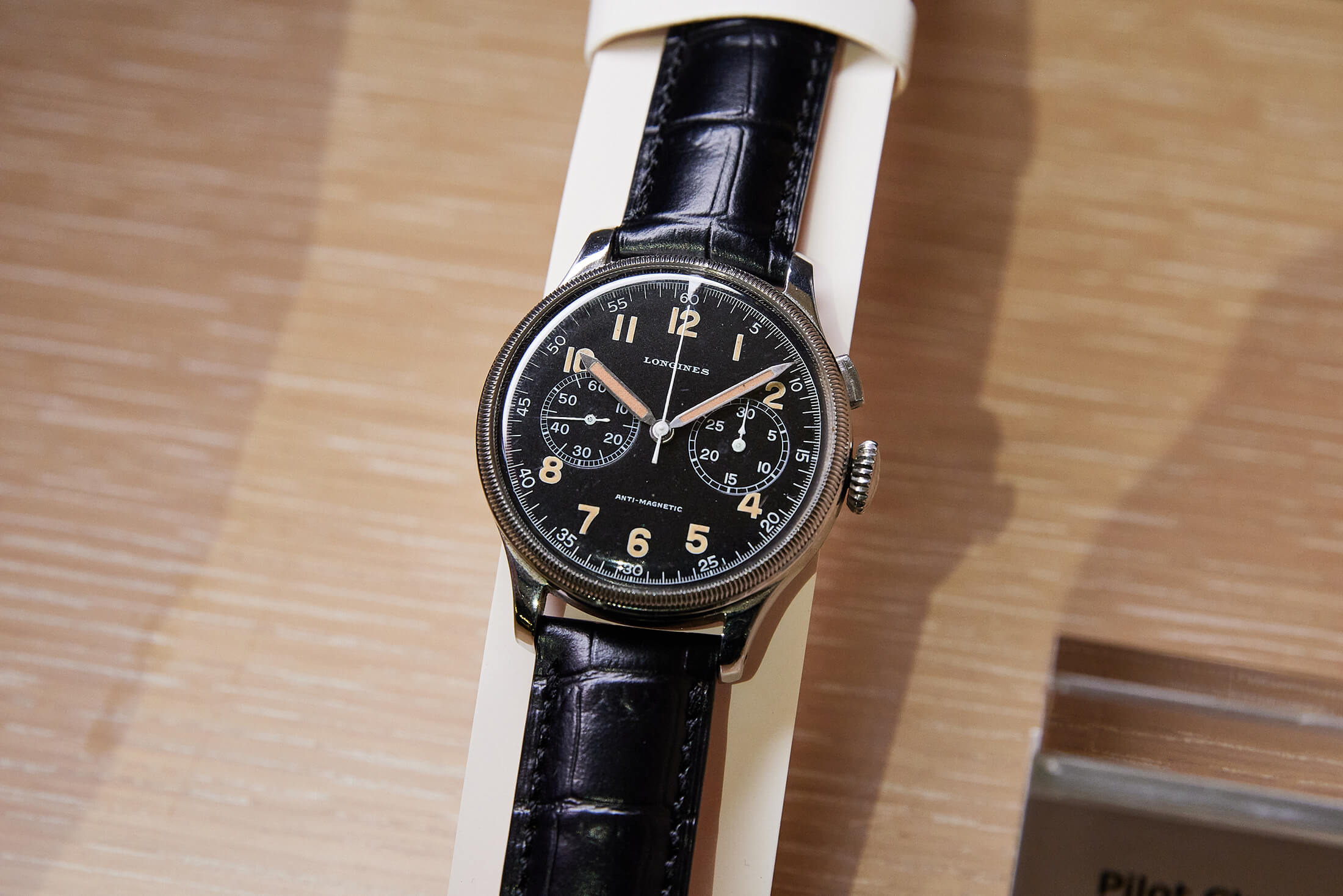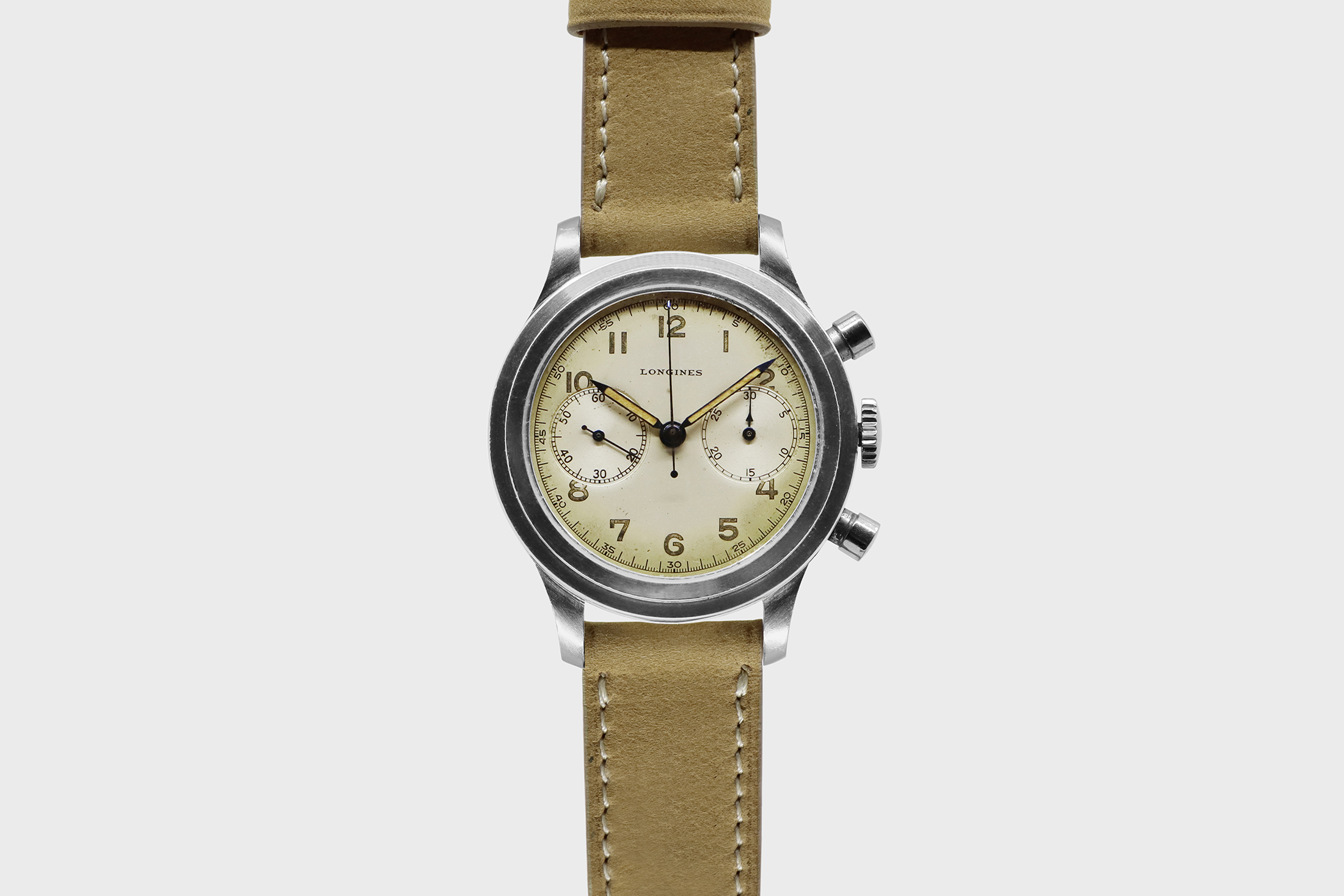 ロンジンのクロノグラフのなかでも特に興味深いのは、1938年に同社が初めてプッシュボタンの特許を取得した1937年開発の防水プッシャー付きフライバッククロノグラフだ。これはマッシュルームプッシャーと呼ばれるが、極めて高価なコレクターピースで、昨年11月にジュネーブで開催されたオークションでは18万2000スイスフラン(日本円で約2805万円)という驚くような落札価格を記録した。