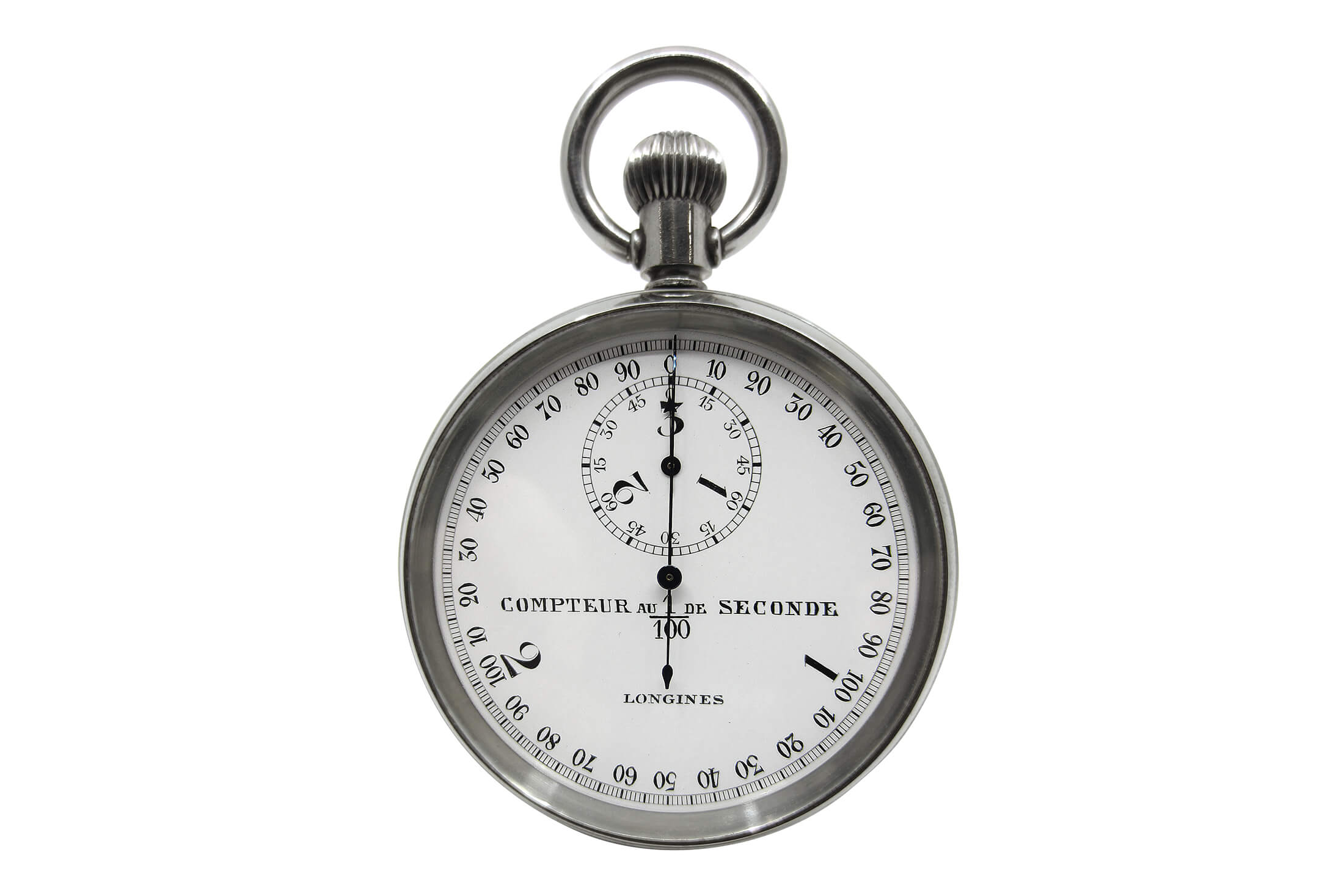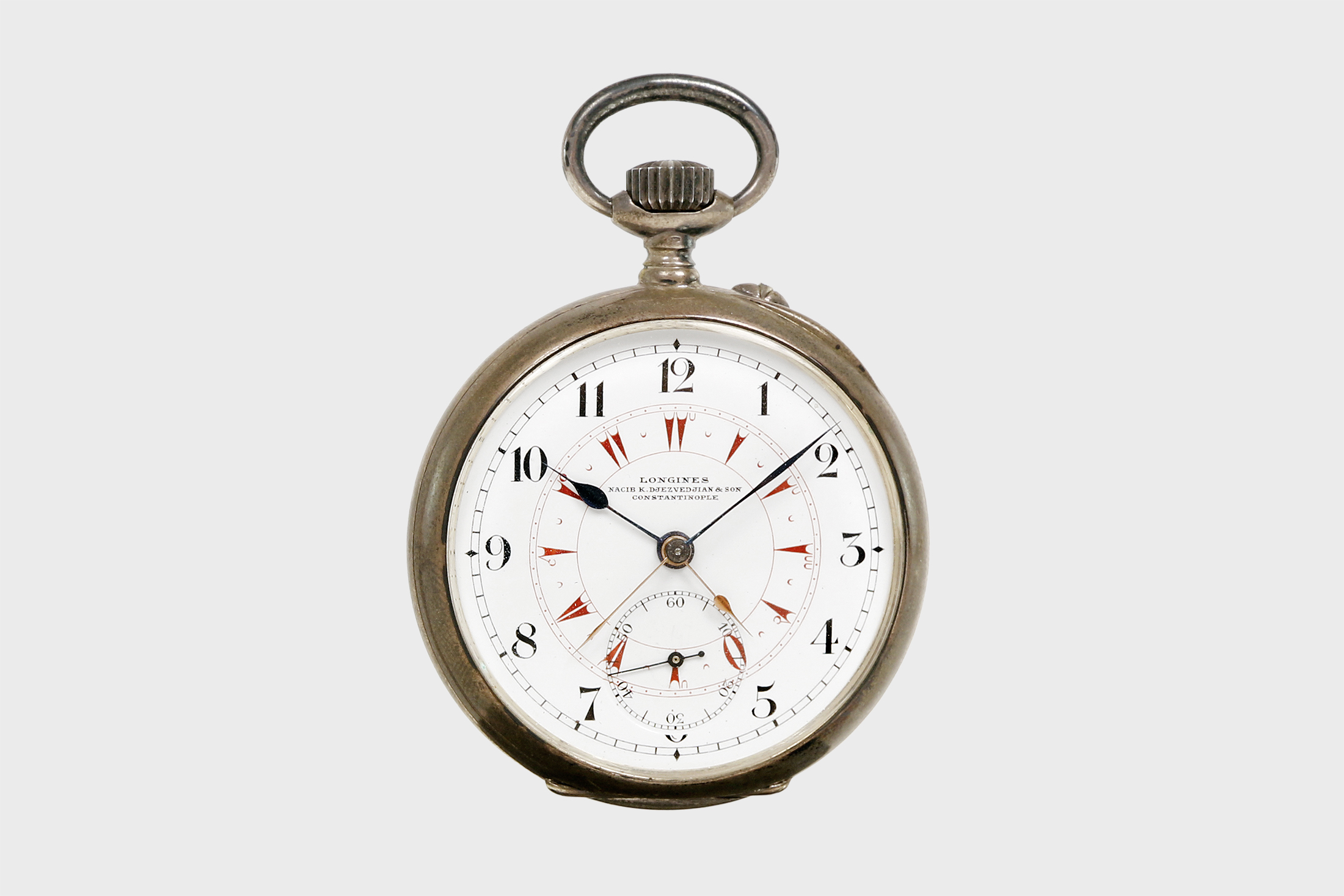 時計史だけでなく、航空史にも絶大な影響を与えたロンジンの3大発明。そのひとつ目は、1908年に生み出された第2時間帯を示す時計だ。しかもこのポケットウォッチは一般的なGMTではなく、ふたつの時刻をそれぞれ時針と分針で示す複雑な機構を有していた。