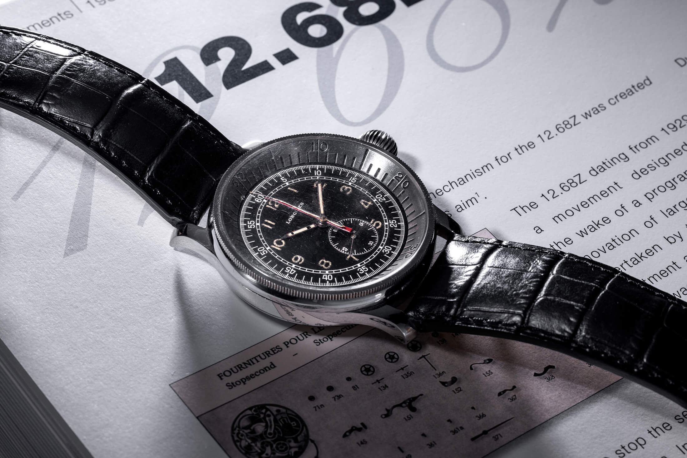 ロンジンはフライバック機構の特許を1935年に出願し、1936年に登録。同年、象徴的なムーブメント、13Zキャリバーを搭載したフライバック機能付きのクロノグラフウォッチがデビューする。写真は1937年に誕生したスターティングタイマー(トライアングル)インジケーター付きの回転ベゼルを備えたパイロットクロノグラフである。