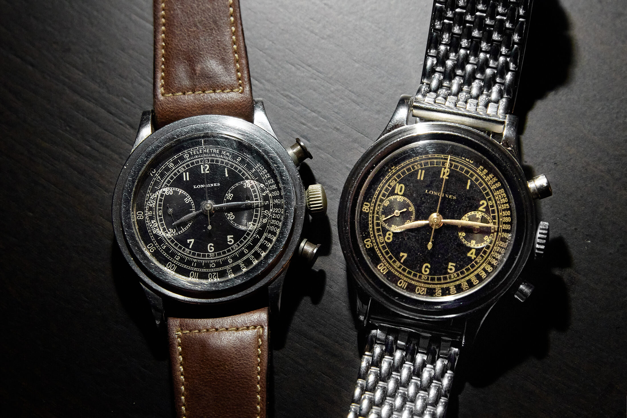 写真の時計は、ともに今イベントに参加いただいたコレクターの方が所有するロンジンのフライバッククロノグラフだ。写真をよく見て欲しい。左のモデルのプッシャーは、極めて希少な存在とされるマッシュルームプッシャーを持つ。