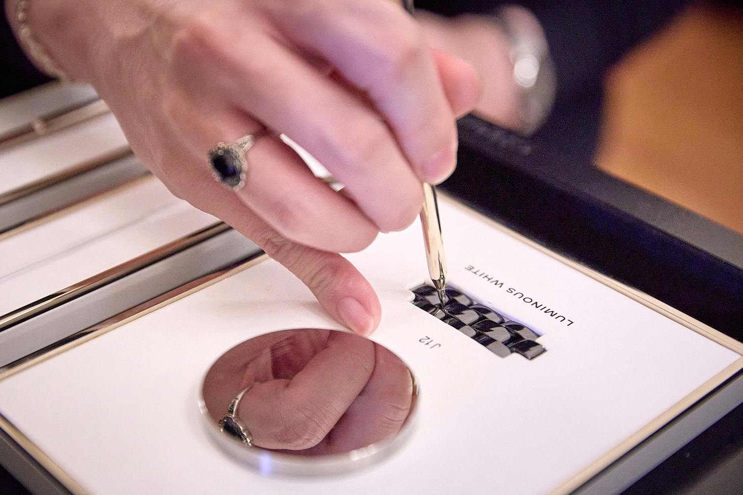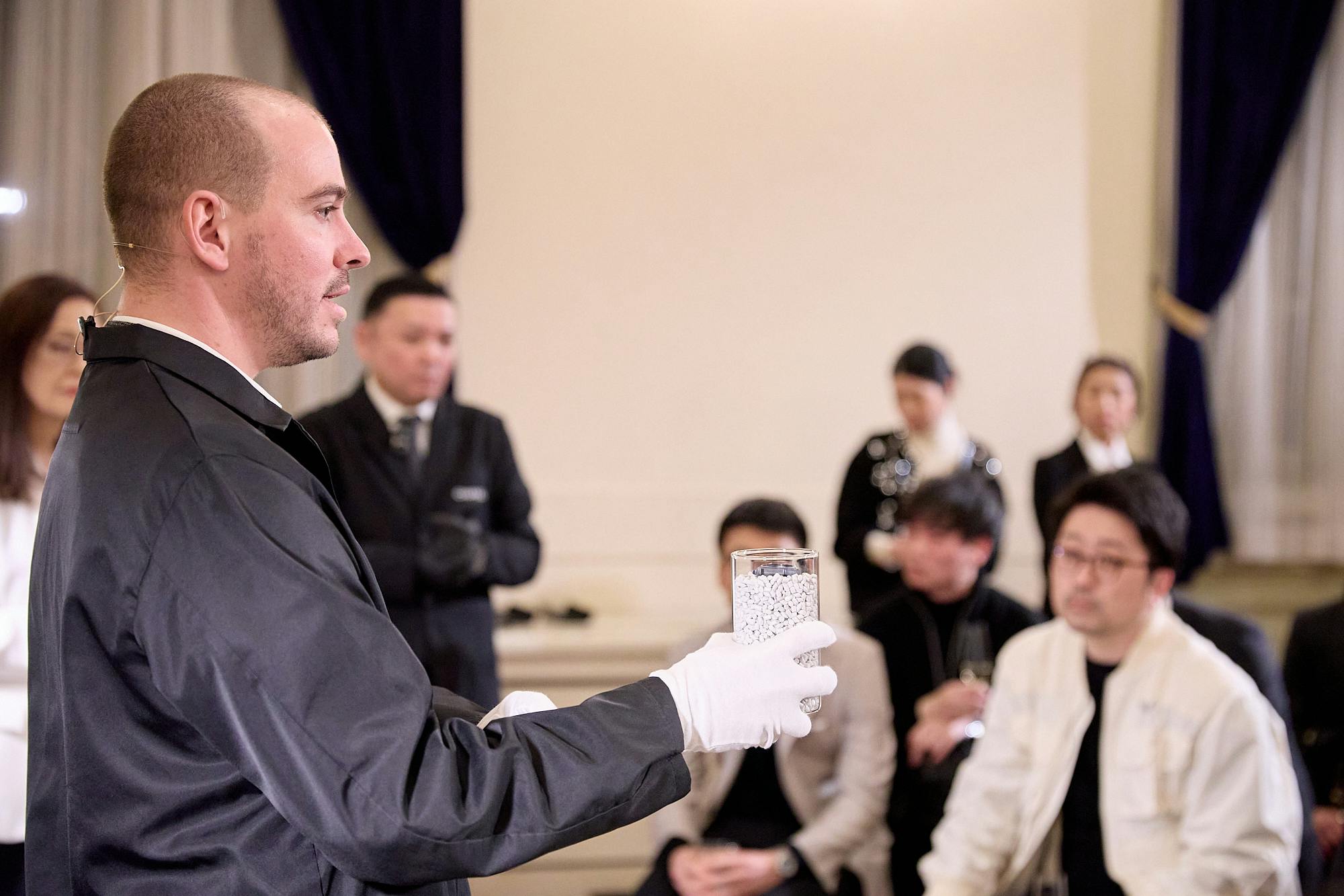 続くQ&Aセッションでは、シャネルのセラミックが持つ色と仕上げの個性にも話題が及んだ。たとえばシャネルのホワイトセラミックは、一般的な不透明な白ではなくわずかに透けるような質感を持つ。これはデザイン上の特徴として意図されたものである一方、こうした表情を備えたホワイトセラミックで長期的に色の均一性を保つのは一般的には難しいという。トークでは、その点をシャネルの技術的な特徴として挙げ、20年前のホワイトセラミックと現在のものでも色が変わらないことにも触れていた。色の表現は容易ではなく、昨年発表されたブルーセラミックは開発に5年を要し、23種類の色味を比較した末に現在のトーンへたどり着いたとのこと。さらに、実現のハードルが高い色として、高温焼成の工程に顔料が耐えにくい赤が挙げられた。