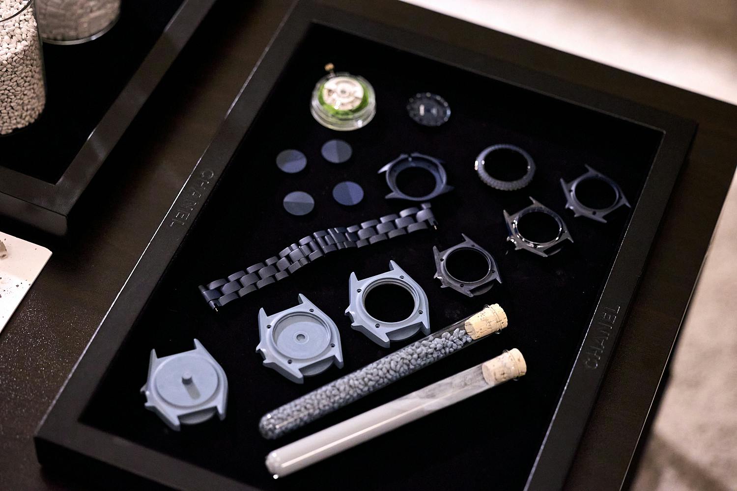 イベント後半には、このイベントのためにスイスから来日したセラミックエキスパートが登場し、進行にはHODINKEE Japan編集長の関口 優が加わった。トークは、酸化ジルコニウムを原料とするセラミックケースの製造工程をたどる内容からスタート。日本で調達した粉末と顔料を、ドイツでバインダーを加えて混合。その後スイスにあるメゾンの自社工房製造で成形、切削、焼結、仕上げへと進む流れが語られた。なかでも印象的だったのは、1400〜1600℃の高温で行う焼結の工程だ。この工程で素材が約30%収縮するため、その変化をどこまで精密に管理できるかがケース精度を左右するという。実際、シャネルではこの収縮率の誤差を0.01%のレベルでコントロールしているといい、素材開発から製造までを一貫して手がける体制の強みもうかがえた。