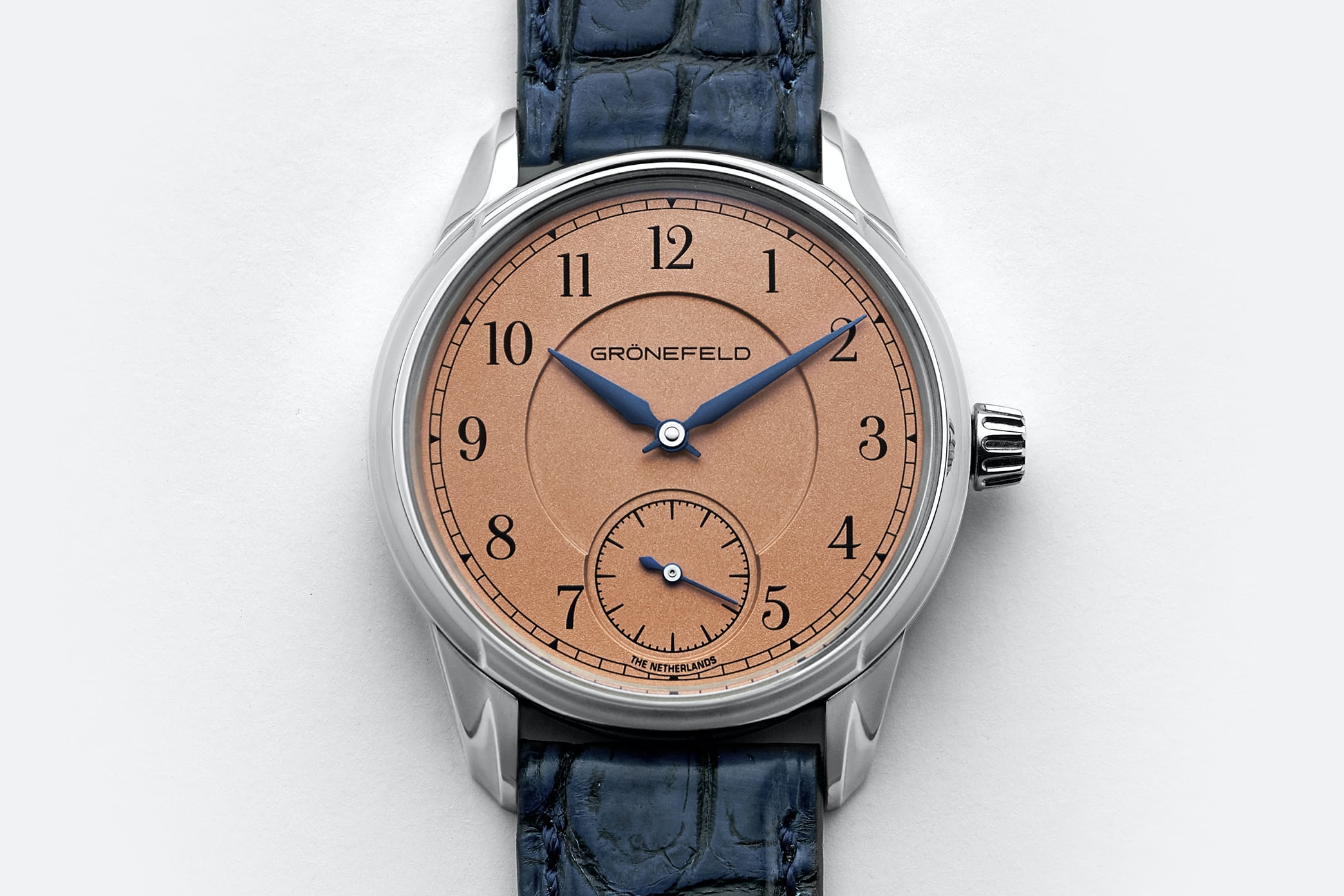 バート&ティム・グロネフェルド兄弟は、9時位置にあるルモントワールを制御するためのダンパーを横向きに上に来るようにするのではなく、ムーブメントの中に引っ込む用に再考しました。これを実現するためには、ミリ単位の調整が必要であり、それが可能かどうか決定するために1ヵ月以上の時間がかかりました。結果的に可能であることがわかり、ブルーの「オラニエンバウム」と呼ばれる数字インデックスを配した全く新しいサーモンダイヤルで作られることになります。直径39.5mmのステンレススティールケースに収められ、12本限定で販売されました。