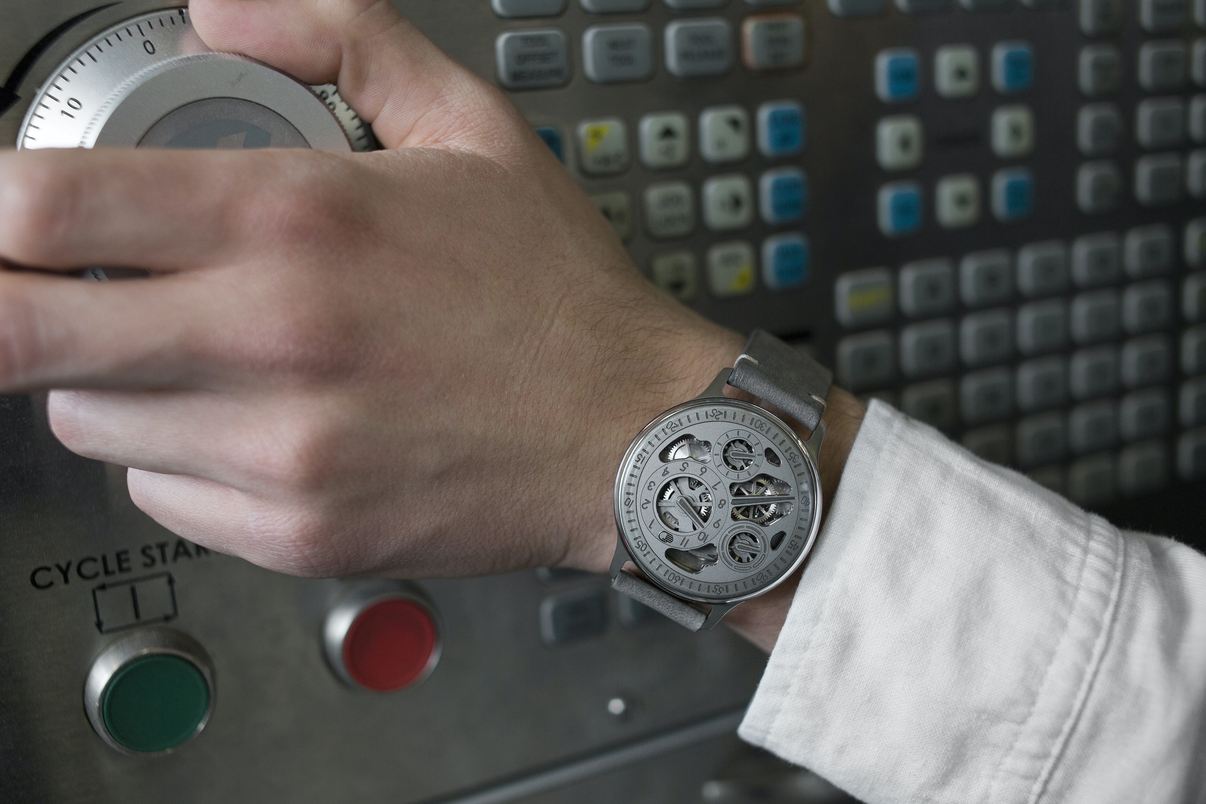 ジャーマンシルバーの文字盤ディスクにサンドブラストを施し、さらに開口部を設けることで、内部のムーブメントが実際に見えるようになっています。針にはダークグレーのスーパールミノバが施されており、暗所での視認性も確保。ケースは、同社で初となるステンレススティールを採用し、リューズはなく、代わりにケースバックを回転させることで巻き上げたり、時刻を設定することが可能です(ムーブメントは、自動巻き)。