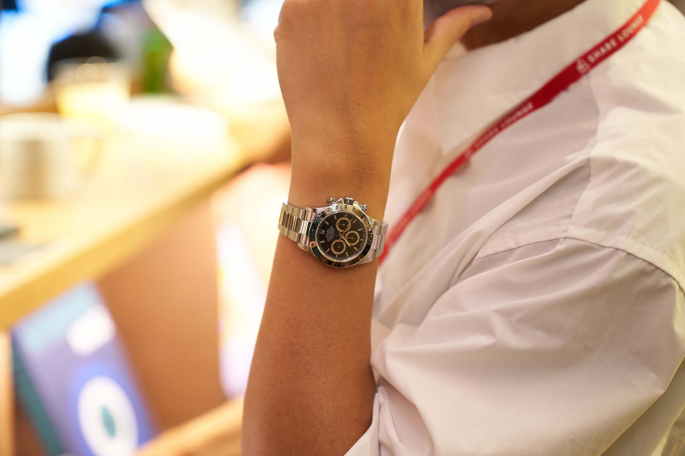100円ショップで入手したディスポーザブルウォッチについて熱く語る田中氏。