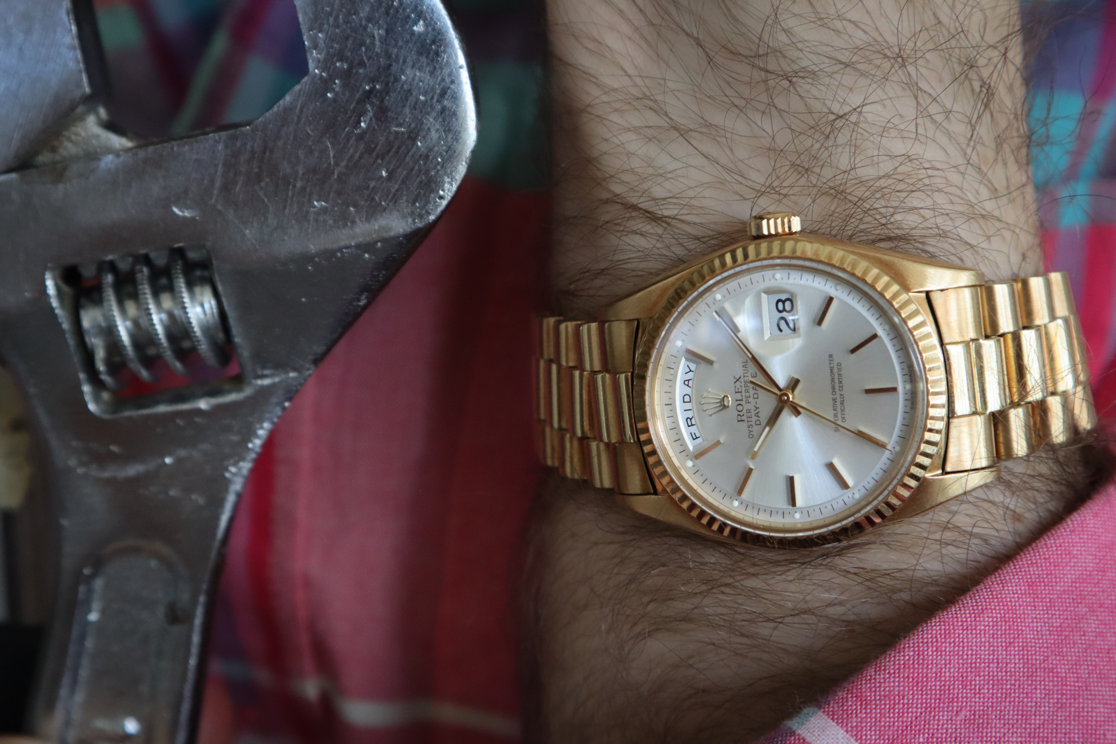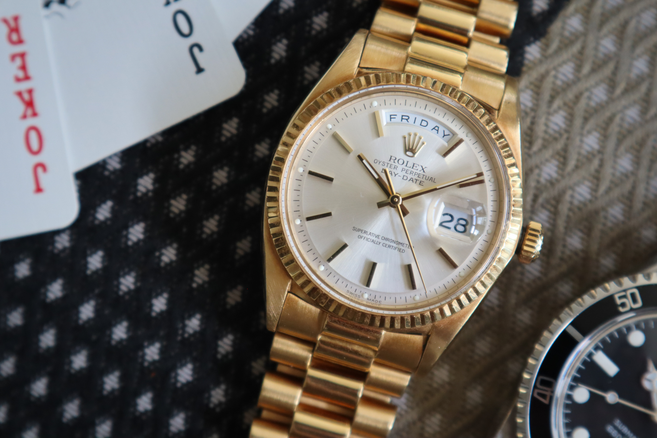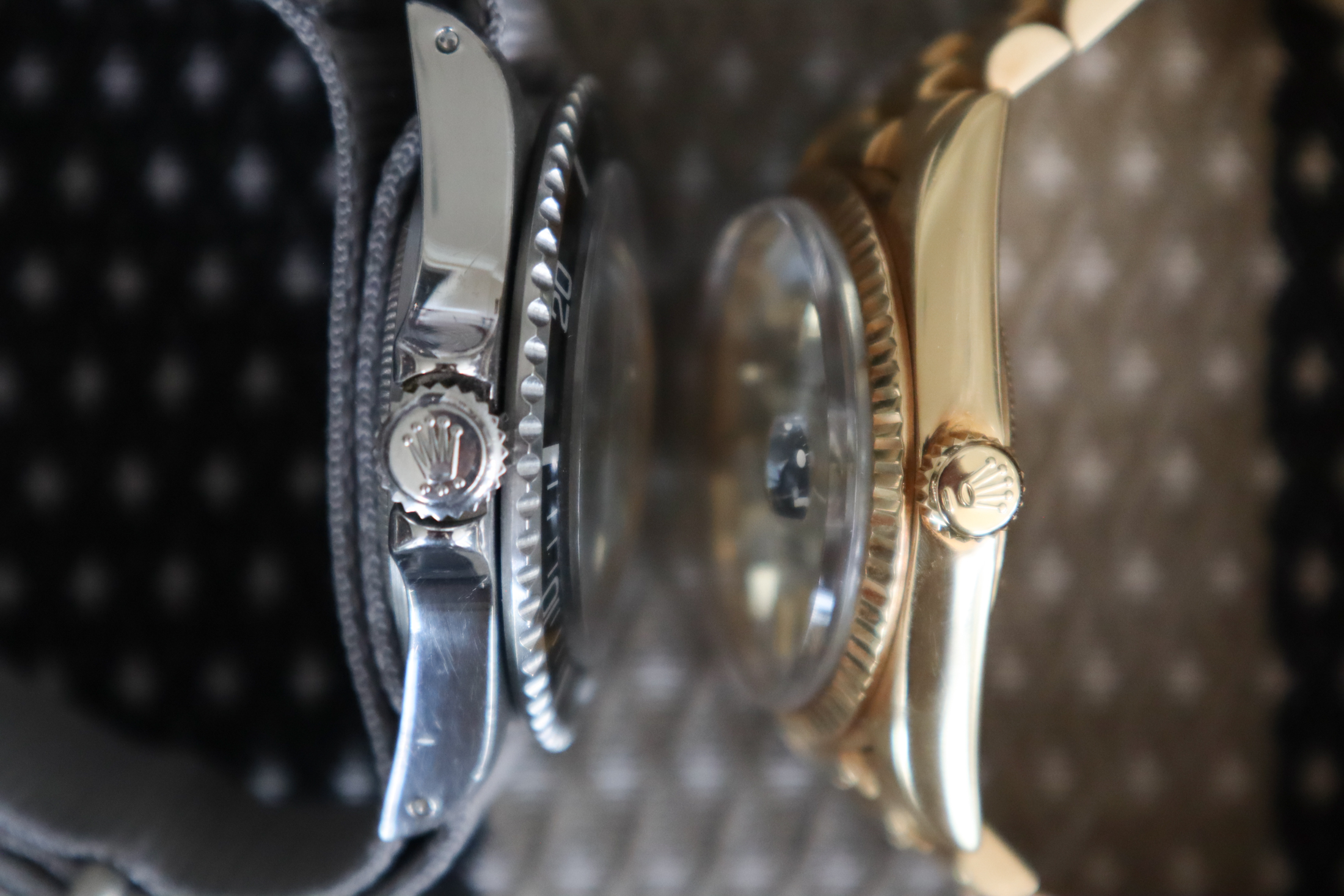 例を挙げよう。私は説明用にアクリルガラスを使用した2つのヴィンテージ時計を選ぶ:マットダイヤルサブマリーナーとイエローゴールド無垢のロレックス デイデイト。1つは、堂々たるツールウォッチであり、もう1つは象徴的なステータスシンボルであるが、風防素材は同じだ。両方とも私にとって憧れの時計であり、スタイルの面ではそれぞれ異なる位置にあるものの、ともに「1つもっていれば充分」 な時計だ。どちらも現行モデルではサファイアクリスタルを使用しているが、では、なぜ私は、技術的に見劣りする傷がつきやすい古いモデルの方を好むのだろうか?