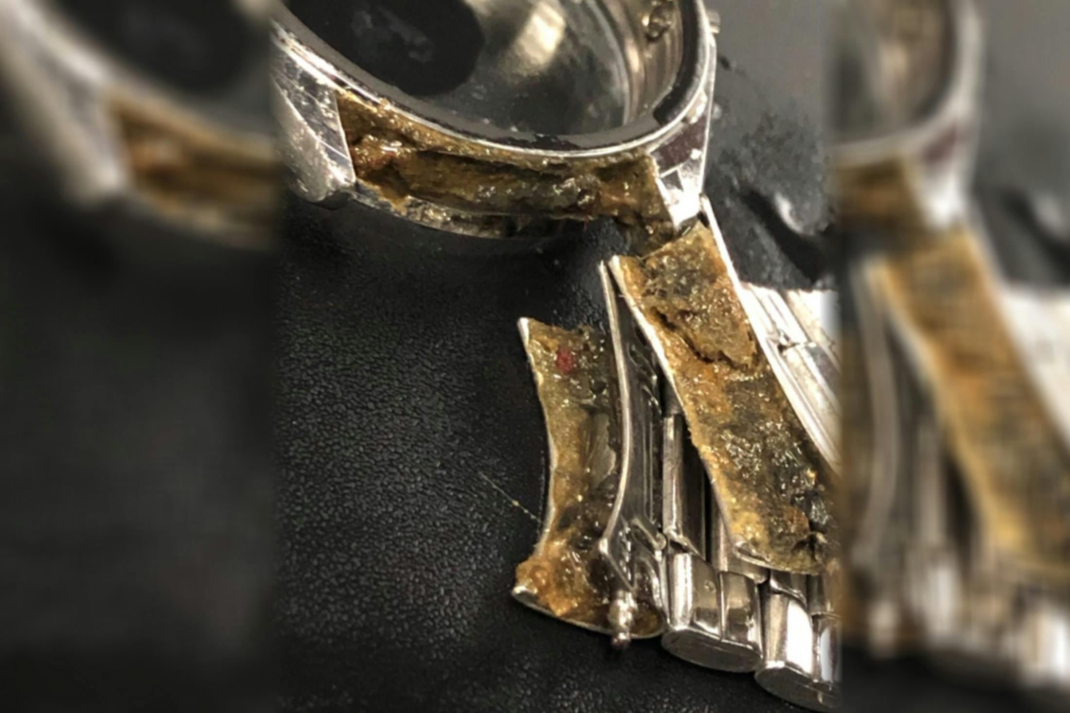 汚れた足についての僕の理不尽な言い分はいいとして、時計を清潔に保つために素人手法に頼ったハウツーを語るつもりはなかったので、どうしょうもなく汚れた時計(またはそれ以上もの)について詳しい友人に電話をかけた。ジェイソン・ギャロップ(Jason Gallop)氏は、バンクーバー(ブリティッシュコロンビア州、カナダ)のダウンタウンエリアにある家族経営の時計小売・サービス店「Roldorf & Co」のオーナー兼時計職人だ。僕は以前、バンクーバーに住んでいたことがあり、ジェイソンと彼のビジネスを高く評価している。また、ジェイソンはBHI(英国立時計協会)の認定を受けていて、ピーター・スピーク・マリン、ステファン・フォルセイ、そしてカリといった人物らと同じクラスで、スイスのWOSTEPを卒業した時計職人だ。最後に、汚れた時計のより強烈な例を見たい人(丈夫な胃を持っている人)は、ジェイソンが、ロドルフのInstagramアカウントで披露している「トキシック・チューズデー」をお見逃しなく。ここで見る時計は、泥に突っ込まれた後のような状態で、サービスデスクにやって来るそうだ(下を参照、失礼)。