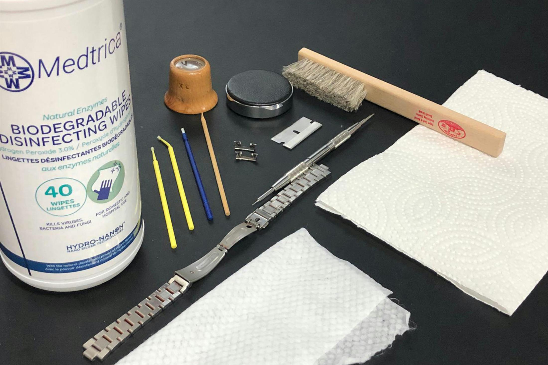 これで、あなたの時計は非常にきれいになったはずだ。上記の手順は一般的なブレスレットのクリーニングにおいても、ほぼ同じだが、取り外した人は、まずブレスレットを温めた石鹸水に浸し歯ブラシできれいに磨くことから始めてもいい。その後、畳んだペーパータオルに挟んで平置きし、上から軽くたたいて水分(と汚れ)を取り除く。