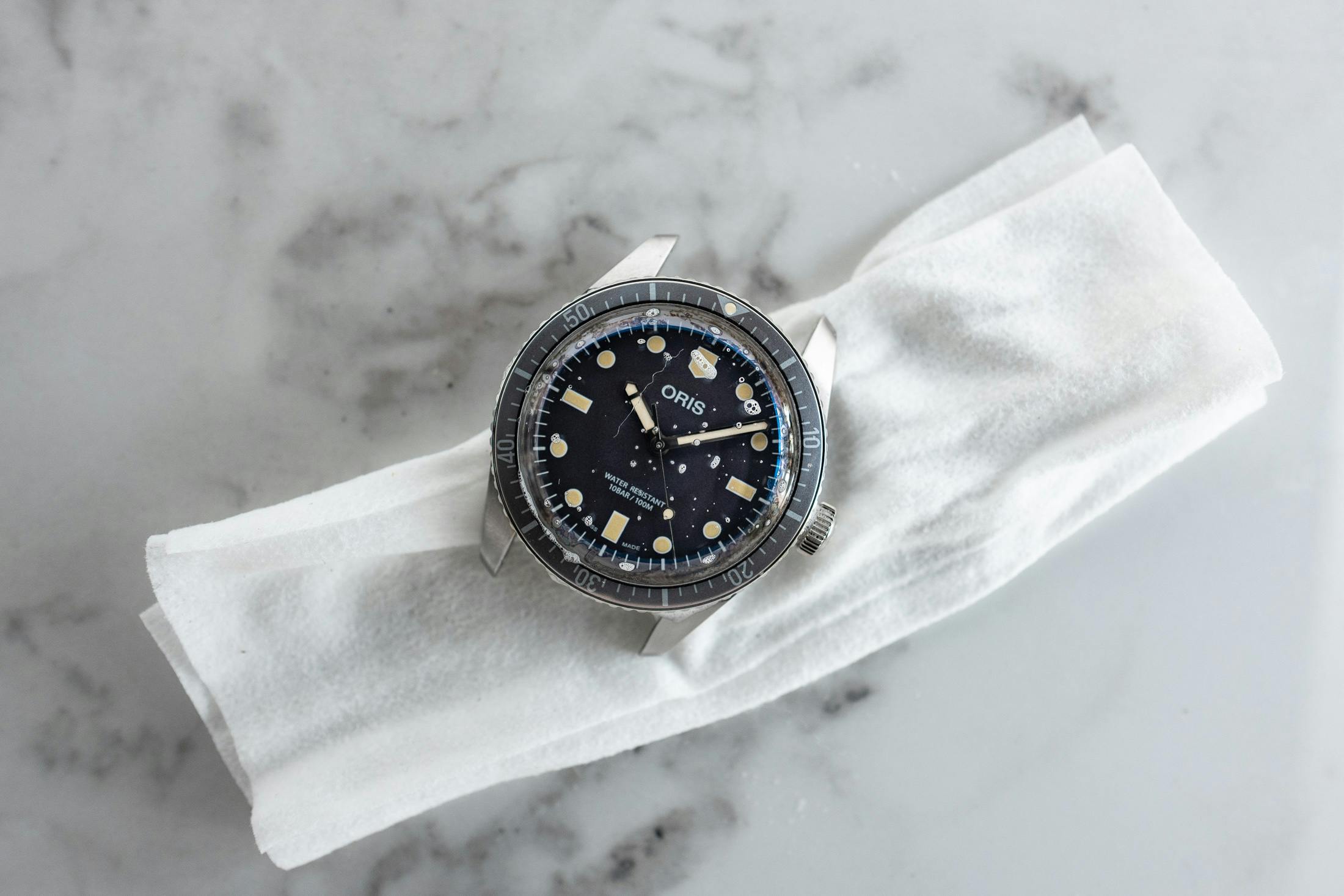 時計のクリーニングは、(できれば簡単な拡大鏡を使って)近くで、時計の状態をよく見るのに最適な時間だ。まずは、湿気の侵入を許しそうな傷を探す。リューズやその他の可動部分の状態には特に注意を払う。同様に、風防のエッジ(ケースに取り付けられている部分)もよく見ること。風防に欠けがあったり、ケースにしっかりと接続されていない目に見える部分がある場合は、時計専門家に検査を依頼し、サービスを受ける必要がある(その後、クリーニングしてもらう)。