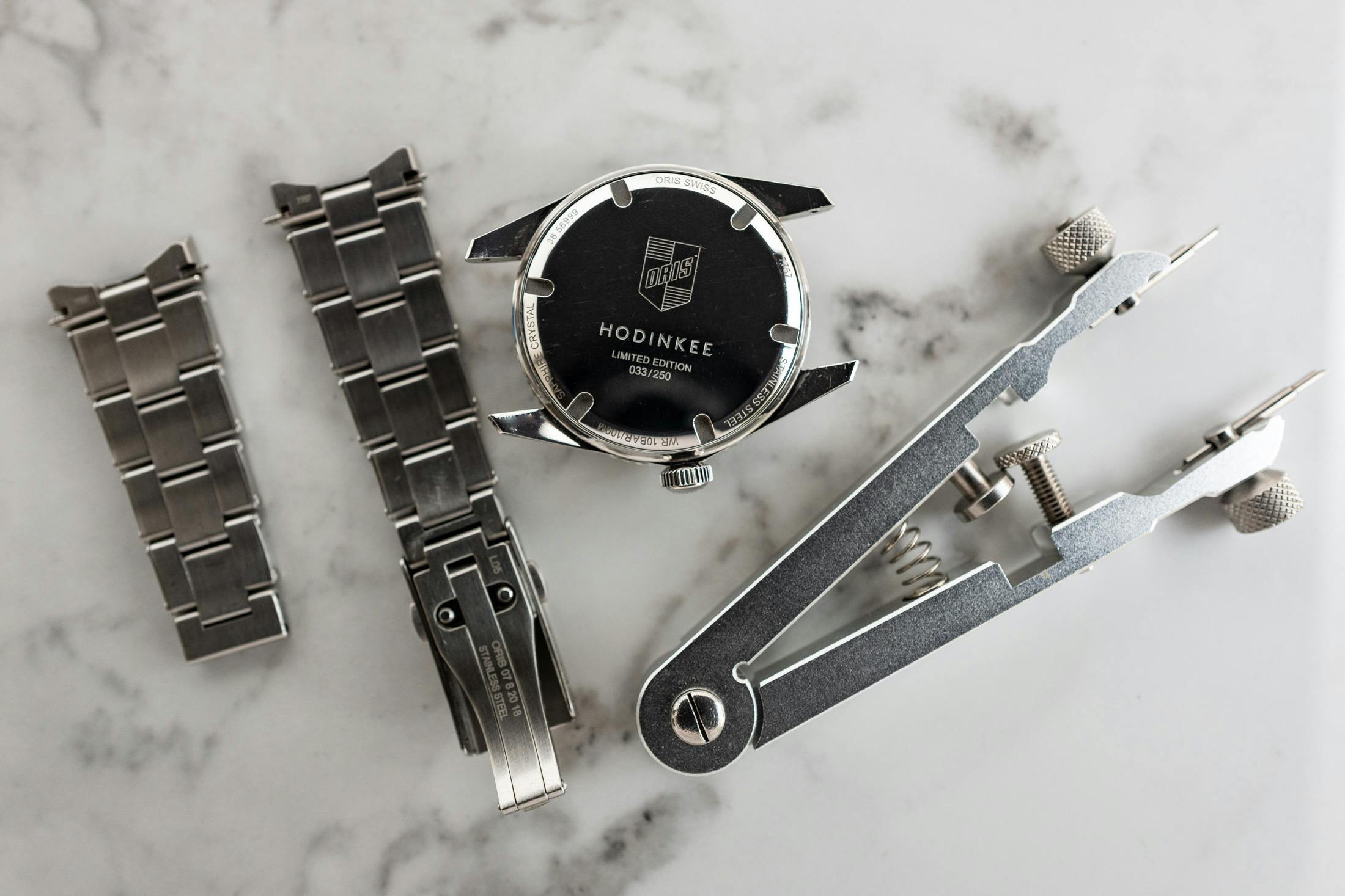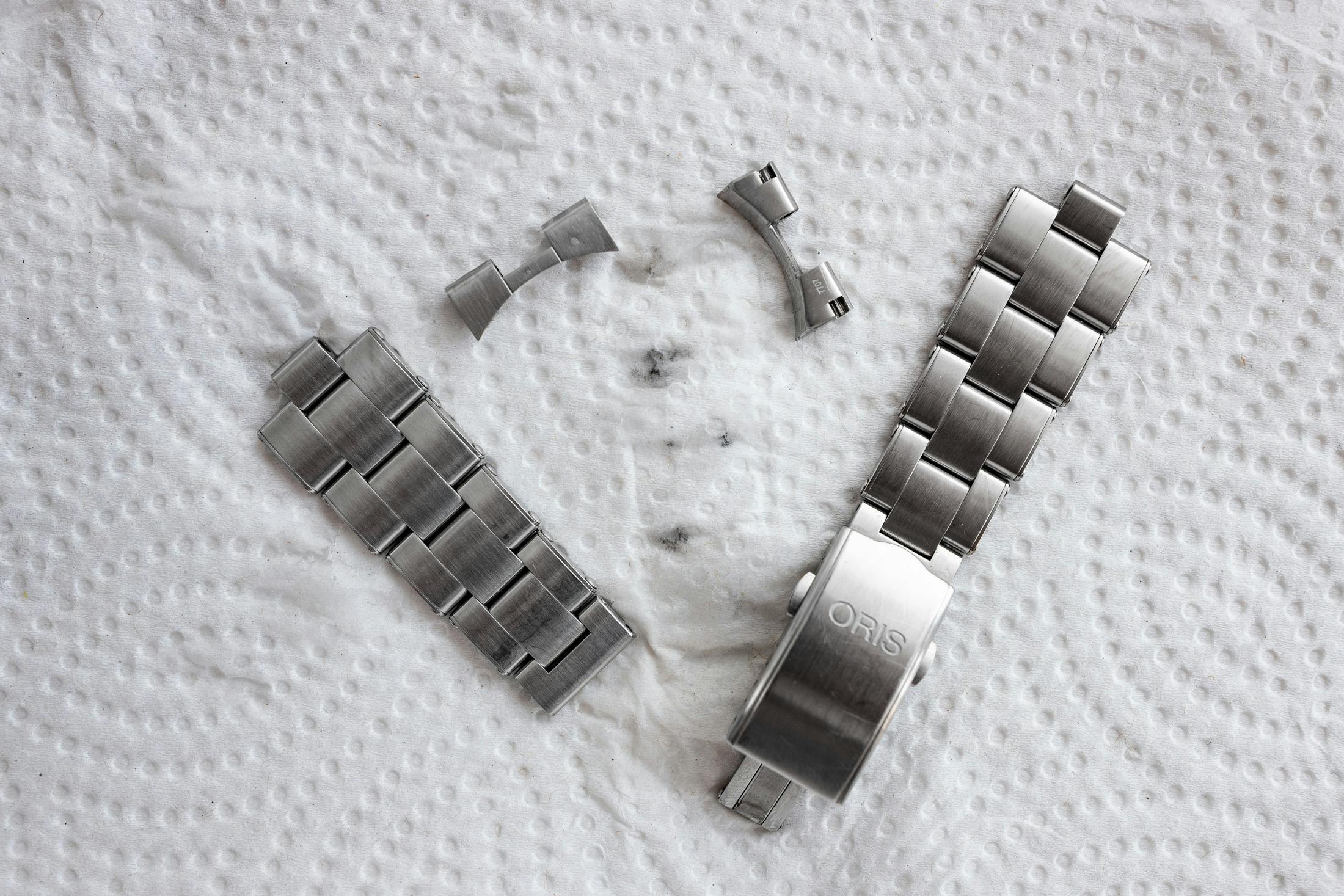 慣れてきたら、適切なばね棒外しを使って、ブレスレットやストラップを時計から取り外す。これにより、時計の最も汚れやすい部分の1つである、ラグの内側とブレスレットのエンドリンクのお手入れがしやすい。後の記事では、ブレスレットタイプ以外のクリーニングや手入れ法について話すが、取り外すことで、時計とブレスレットの両方をより簡単にクリーニングすることができる。いずれにしても、外してしばらく横に置いておく。