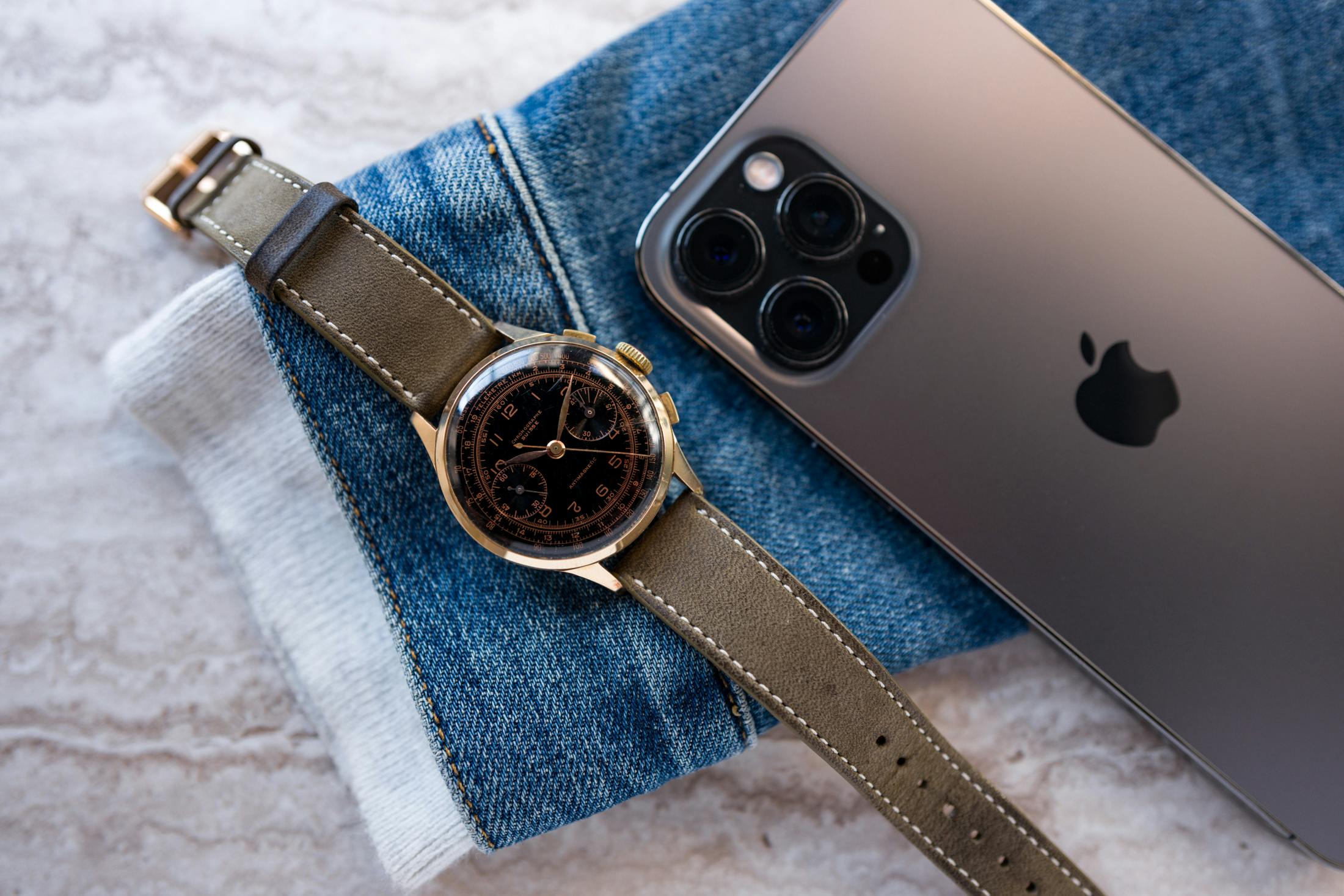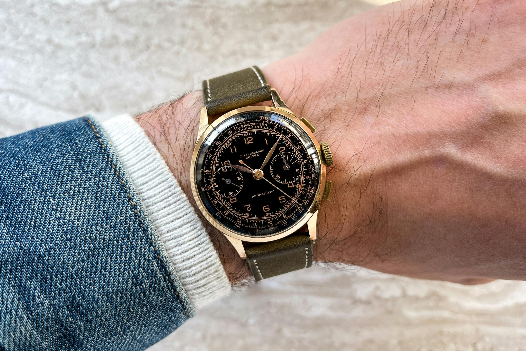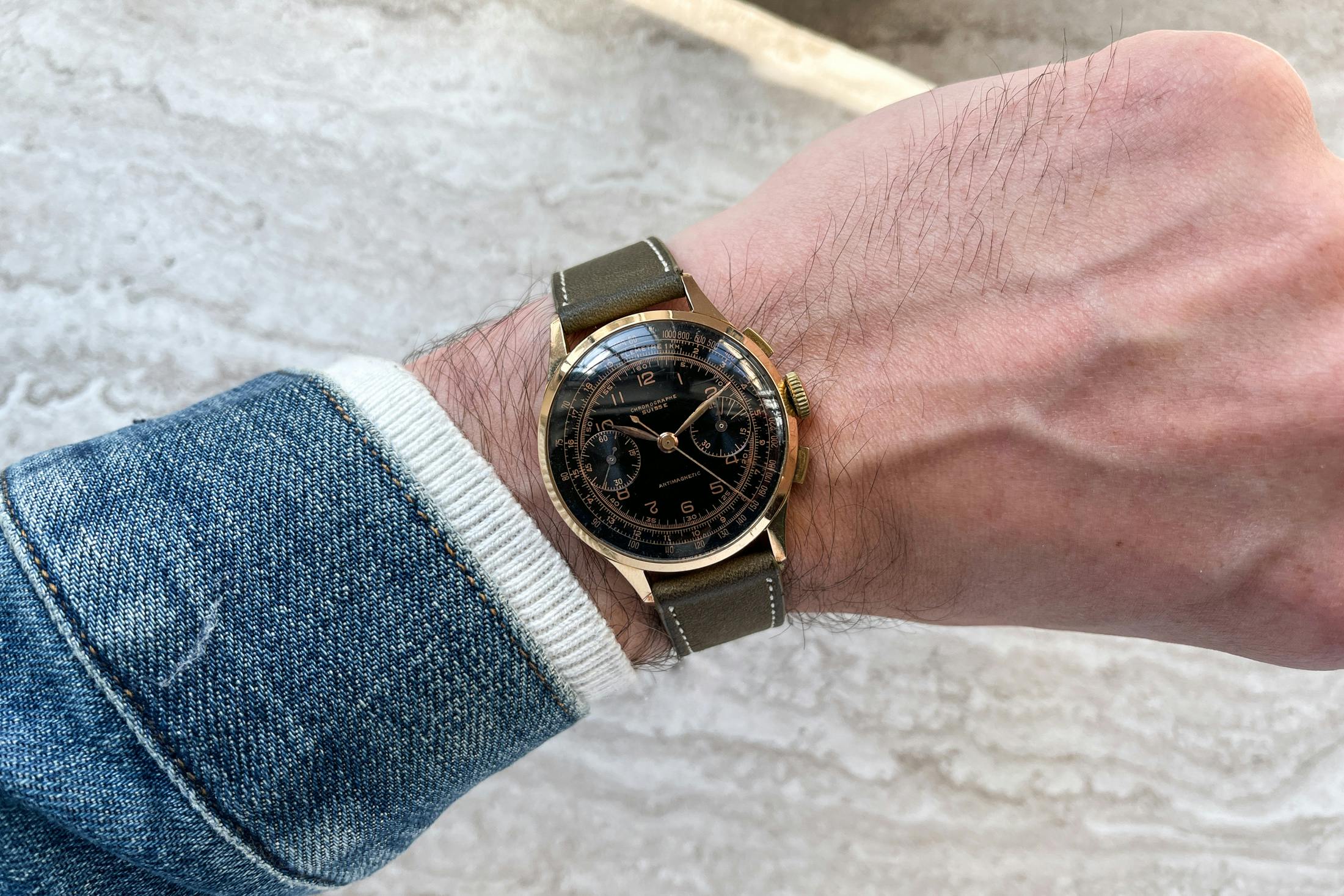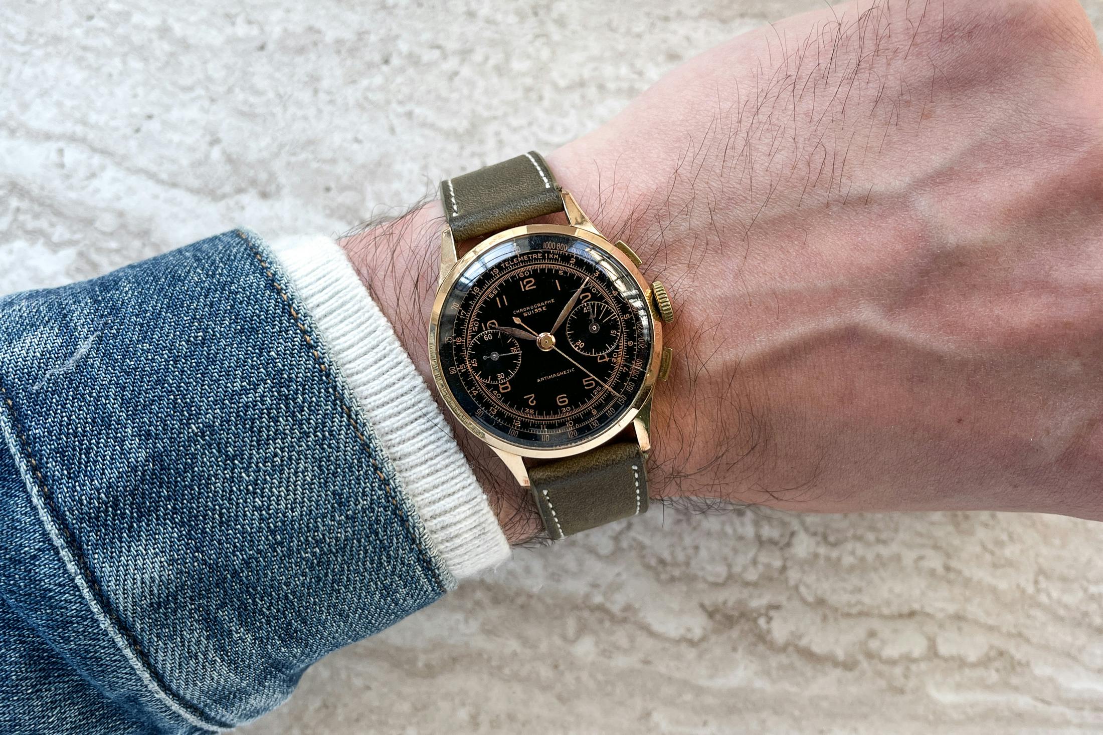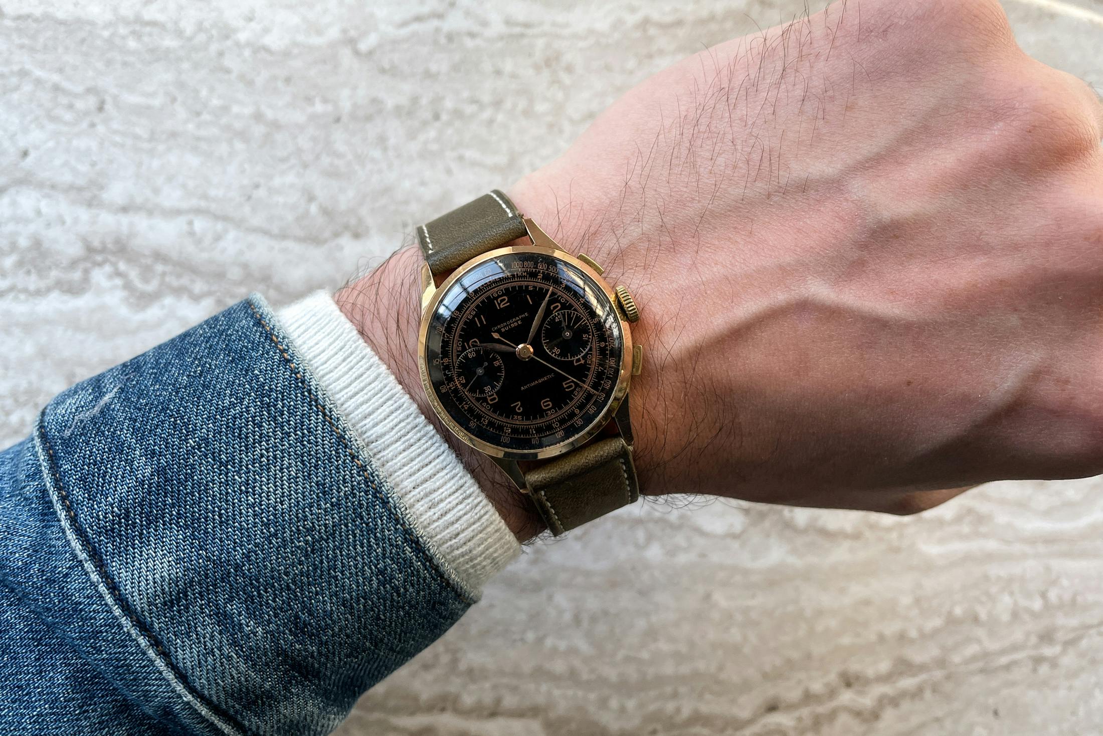 ブロックなし(反射を隠すための)で撮影した例。この古いクロノグラフのやや光沢のあるダイヤルとプレキシ風防によって、どれだけのことがバレるかに注目。