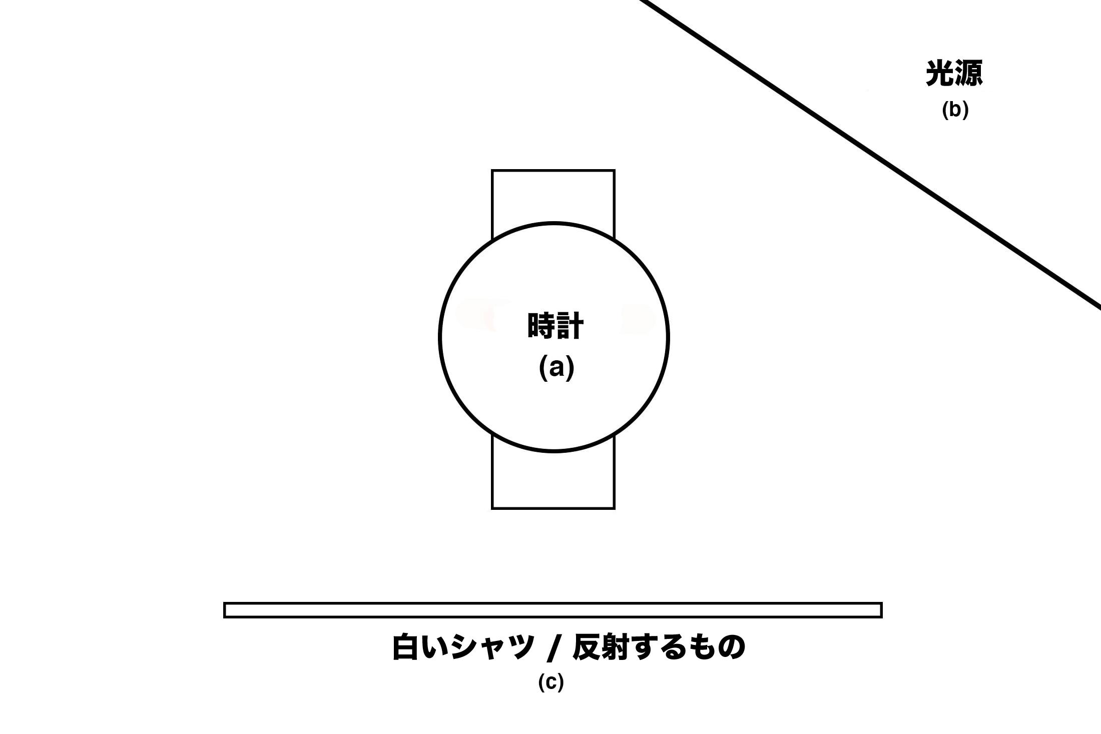 同様に、設定の要素は同じで、手首に着けた時計(a)、光源(b)、反射するもの(c)がある。