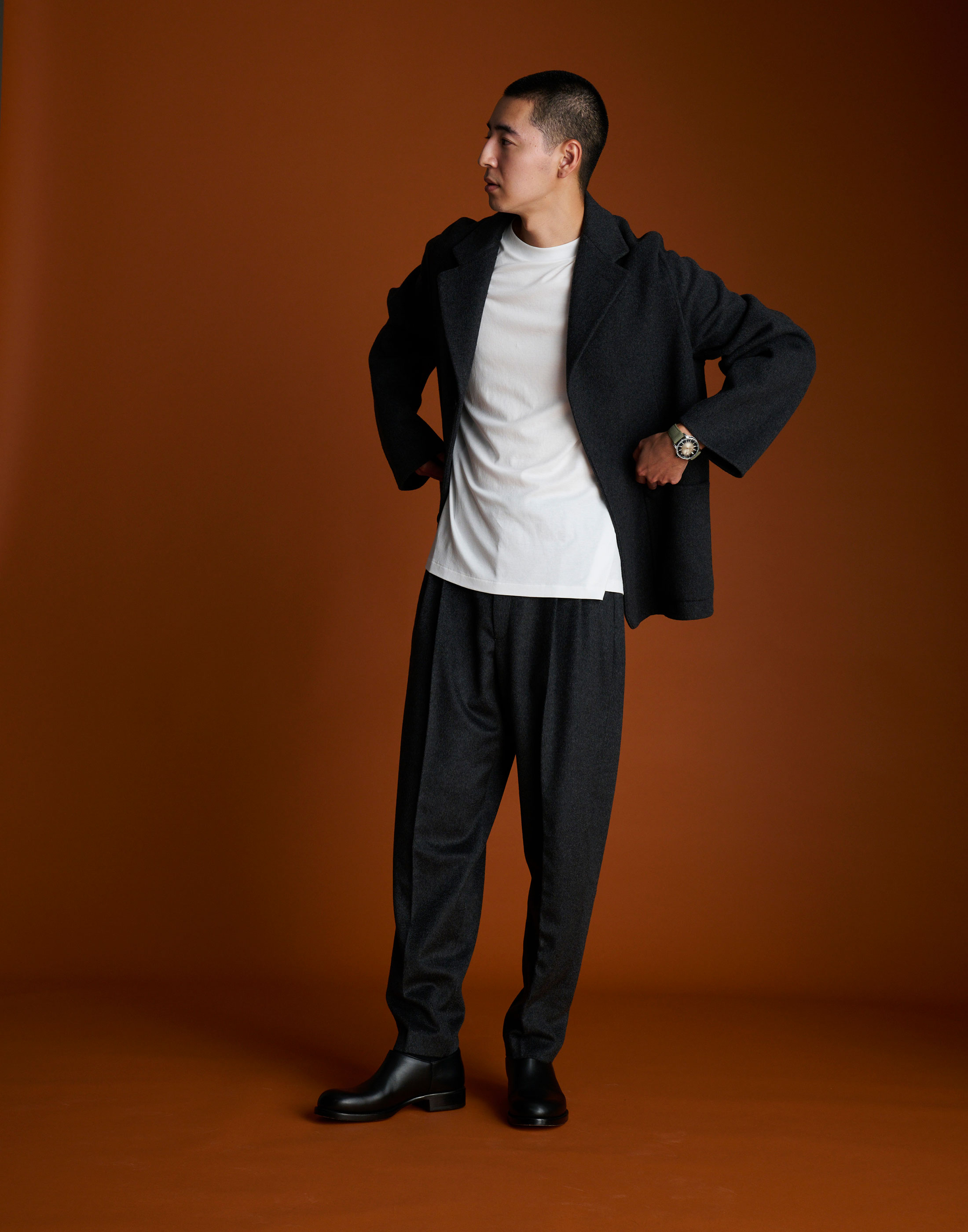 中厚手の起毛カシミアを用いた、ボックスシルエットのジャケットとアンクル丈のテーラードパンツ。ジャケットは高めに設定された襟とゴージラインで、アウターとしての主張をキープしつつ、幅を太くとった腕で無二の雰囲気に。特徴的なジャケットに合わせるのは、現在の主流ではないながら新鮮さを感じさせるテーパードかつ、ドロップクロッチ型のパンツだ。メンズではまだワイドシルエットが主流だけれど、ボリュームのあるジャケットと絶妙なバランスを生んでいる。