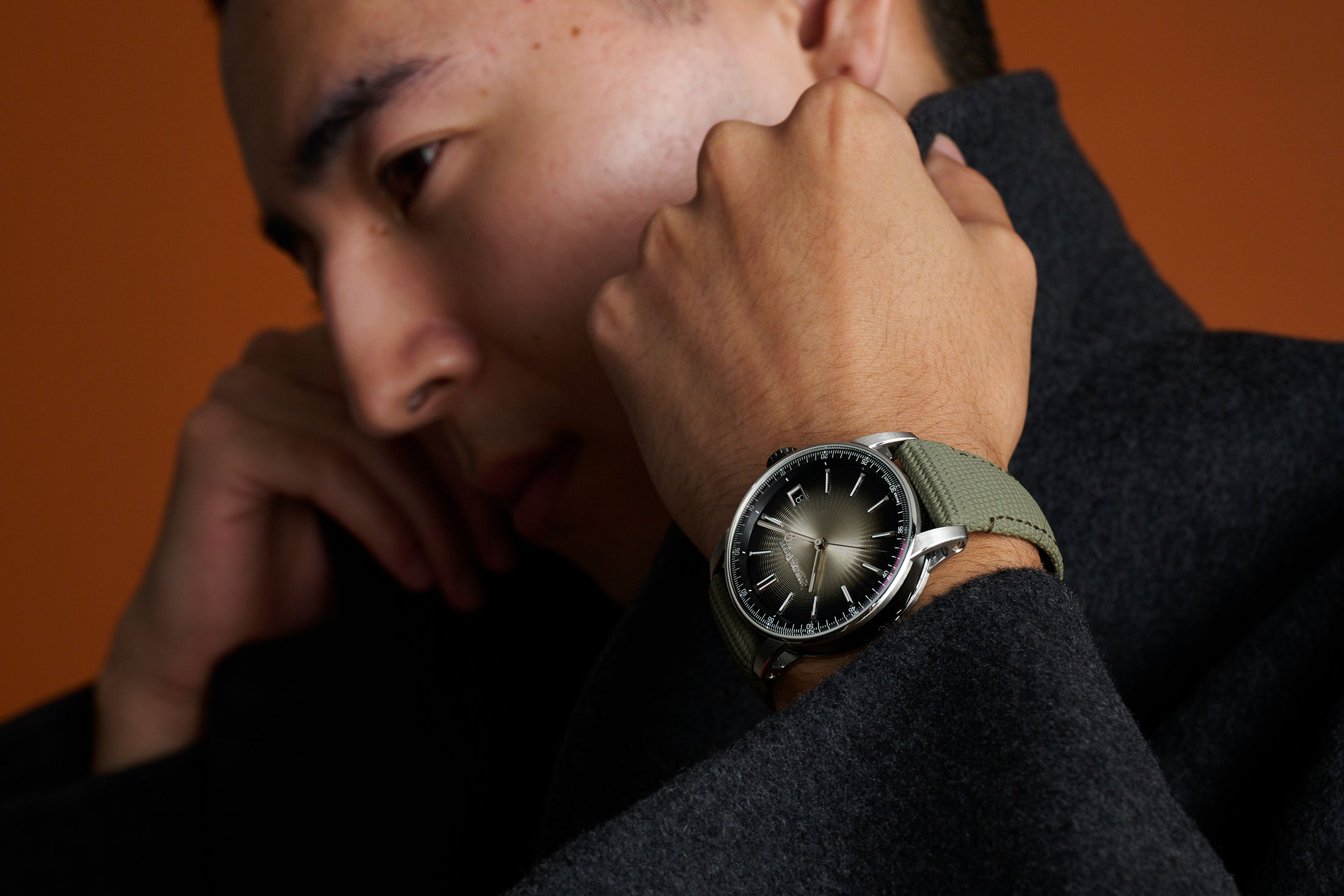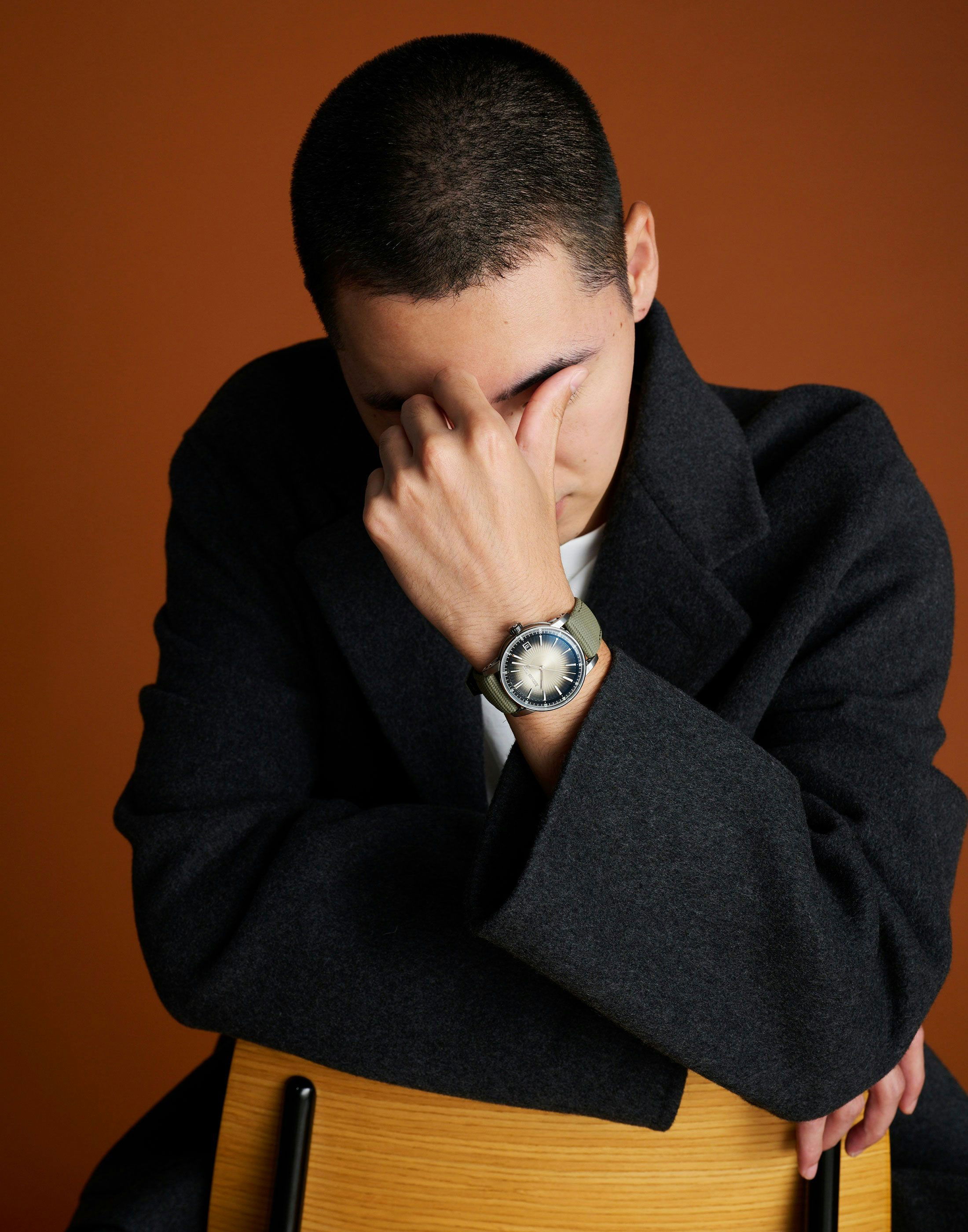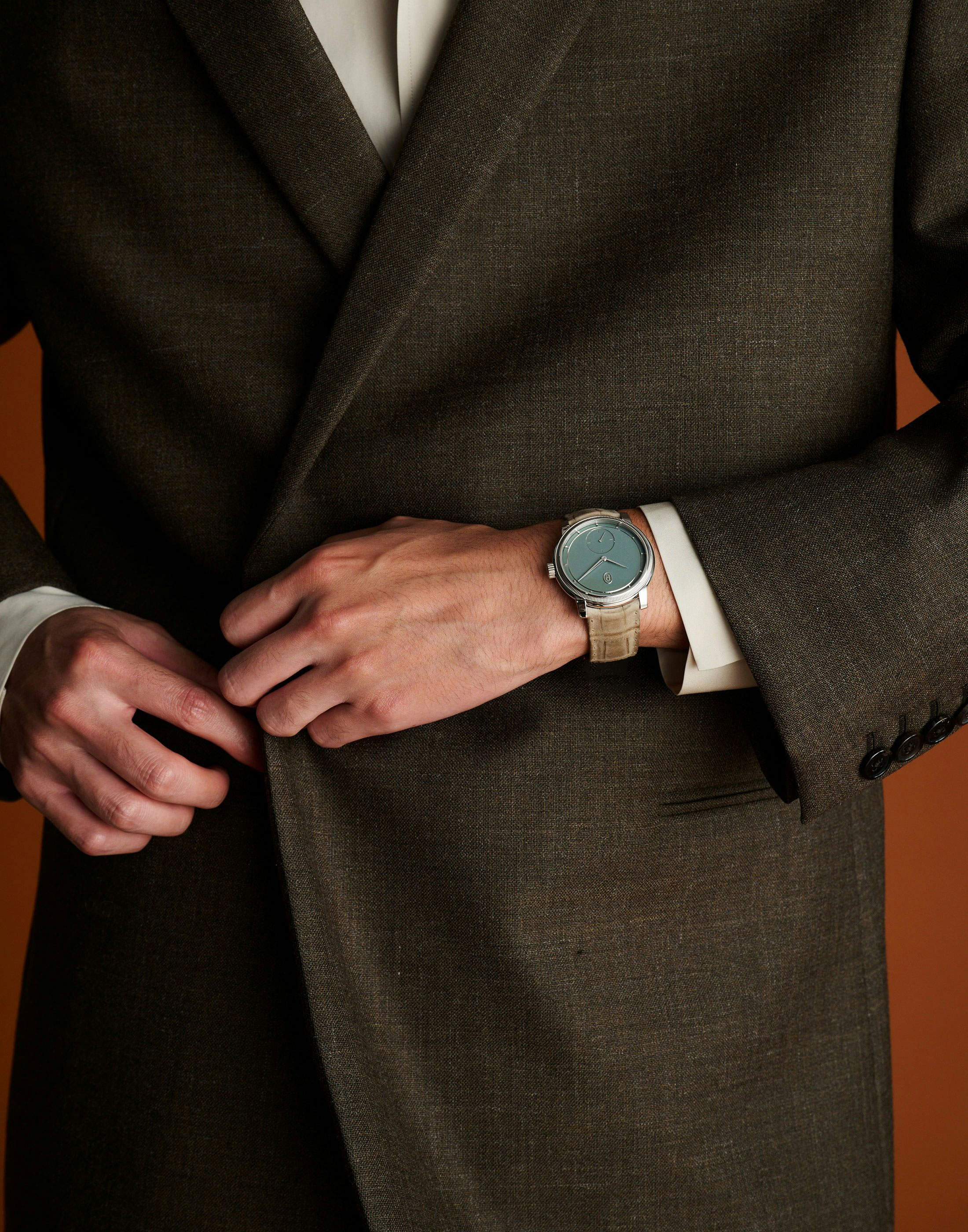 こうしたトーン オン トーンの着こなしには、あまりコントラスをつけずに時計を選ぶ方がコーディネートが簡単だ。従来からある黒や白文字盤でももちろん合わせられないわけではないが、文字盤の製造技術が向上したことで近年増えているニュアンスカラーは、さらに全身の完成度を上げてくれるはずだ。