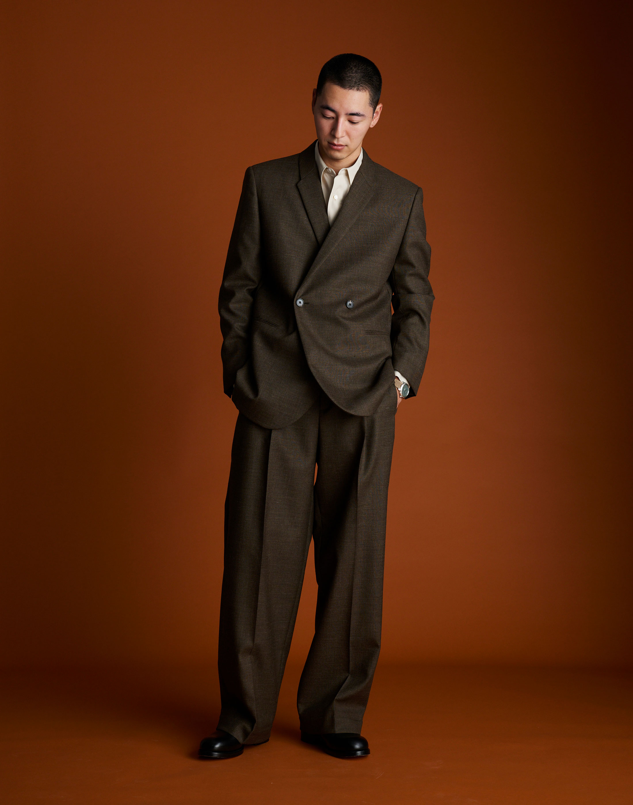 シダーブラウンを配したダブルブレストのセットアップは、100%ウール製でサラりと纏うことができる逸品。ボタンはひと組かつ、位置が高く設定したことでとても狭いVゾーンが特徴だ。ノッチドラペルの雰囲気も手伝ってアーティなテイストが満載であり、自分の個性を強く打ち出したいときに纏いたいルックだ。