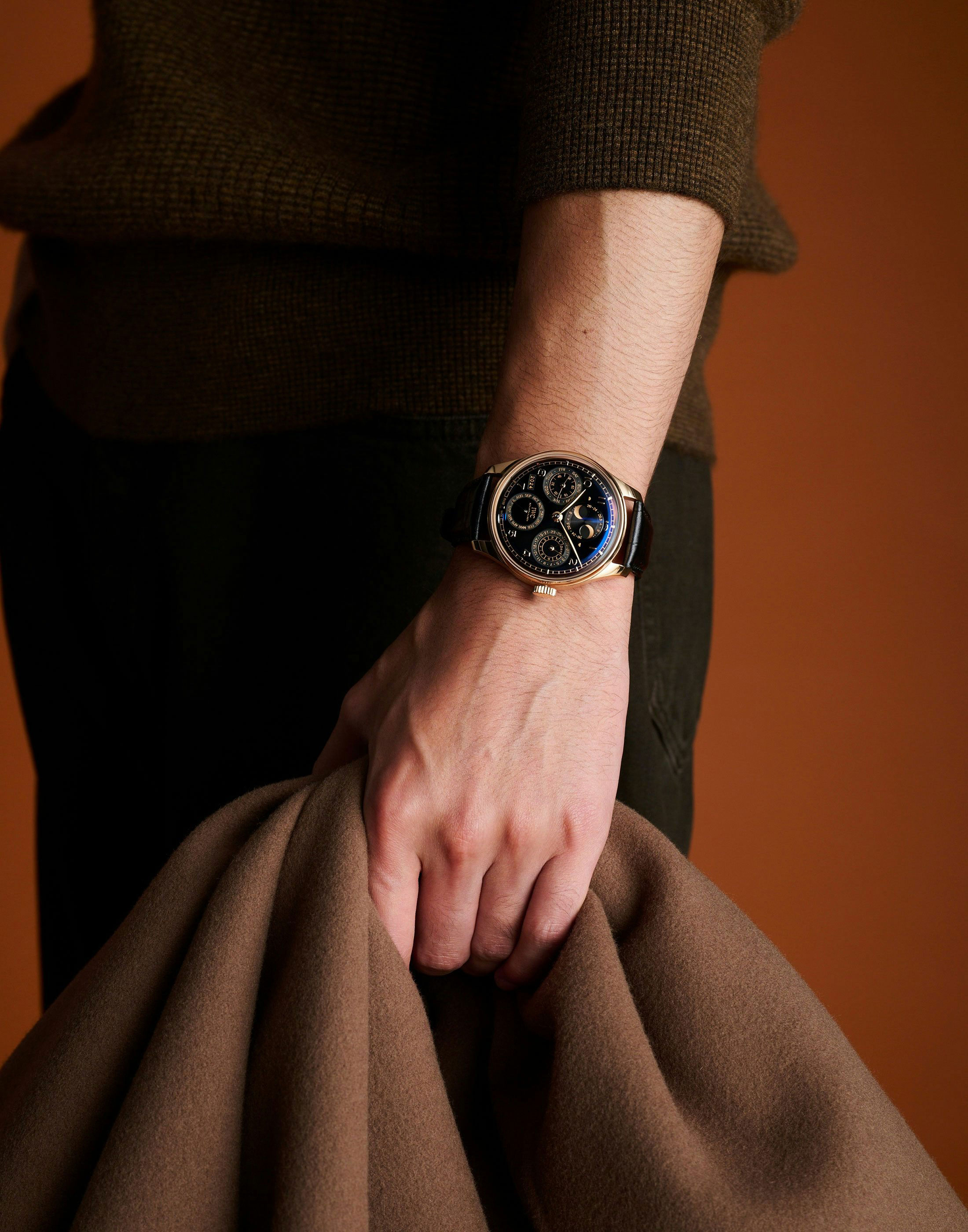 ブラウン×ブラックは最近になって重宝されだしたカラーコードだ。どちらもベーシックな色味ながら、このザ・ロウのルックのように微妙な色の明るさと素材感で表情を与えられれば、凡庸さが一気に垢抜ける。2024年、IWCのポルトギーゼ・パーペチュアル・カレンダーに追加されたオブシディアンブラックの艶やかな文字盤は、一見アンマッチに見えるこうしたザラッとした質感のコーディネートを、補完するようにまとまって見せるから驚きがあるだろう。