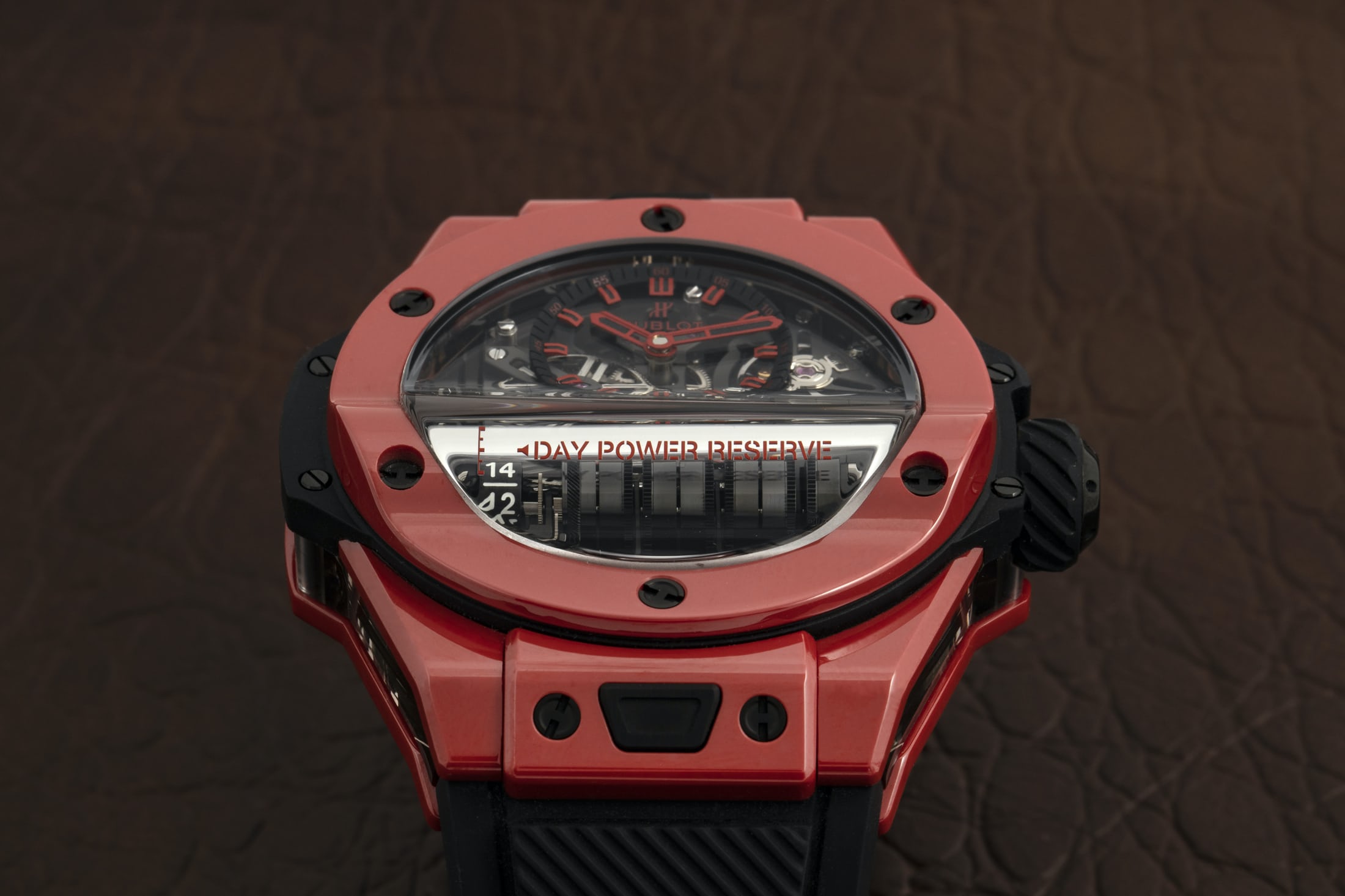 輝かしい栄光を手にしながら、ウブロはパワーリザーブの限界値を超える挑戦からは一歩引いてはいるが、ロングパワーリザーブを搭載するニッチな市場で存在感を示している。このカテゴリにおける現在のフラッグシップモデルは、直列に並んだ7つのバレルが生み出す約14日間巻のMP-11シリーズである。直径45mm×厚み14.4mmとかなり大型ではあるものの、かつてのラ・フェラーリよりはずっと装着性に優れるモデルだ。MP-11はCal.HUB9011のプラットフォームとしてデビューして以降、様々な素材をケースに採用してきたが、2020年1月にドバイで開催されたLVMHウォッチウィークでお披露目されたのが、ウブロが特許を取得したレッドセラミックである。