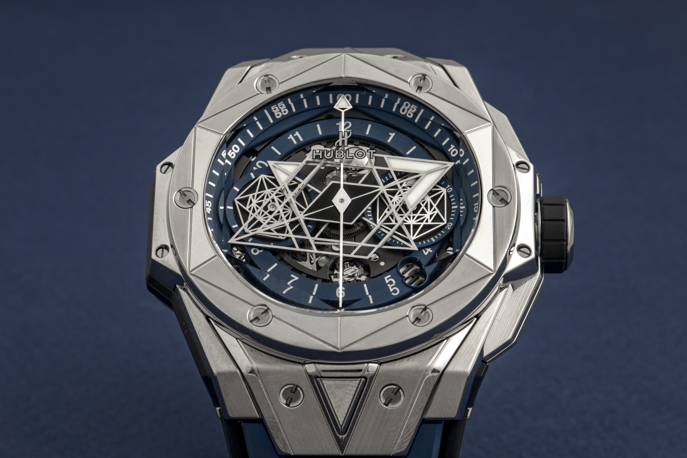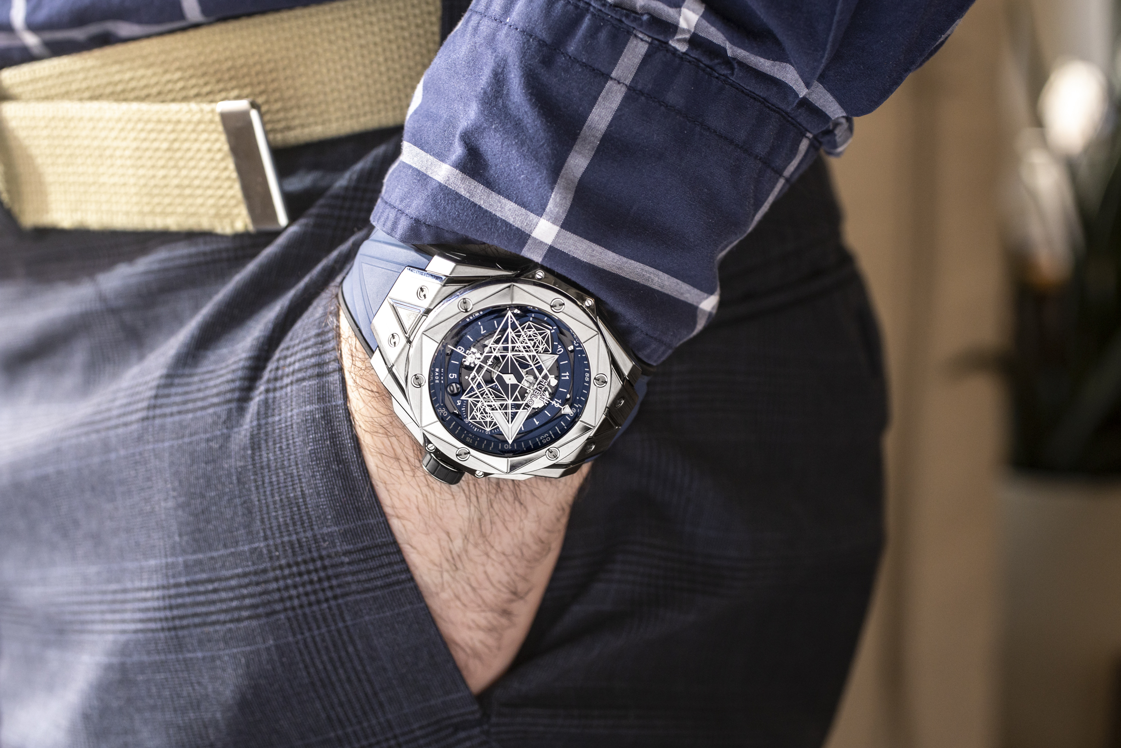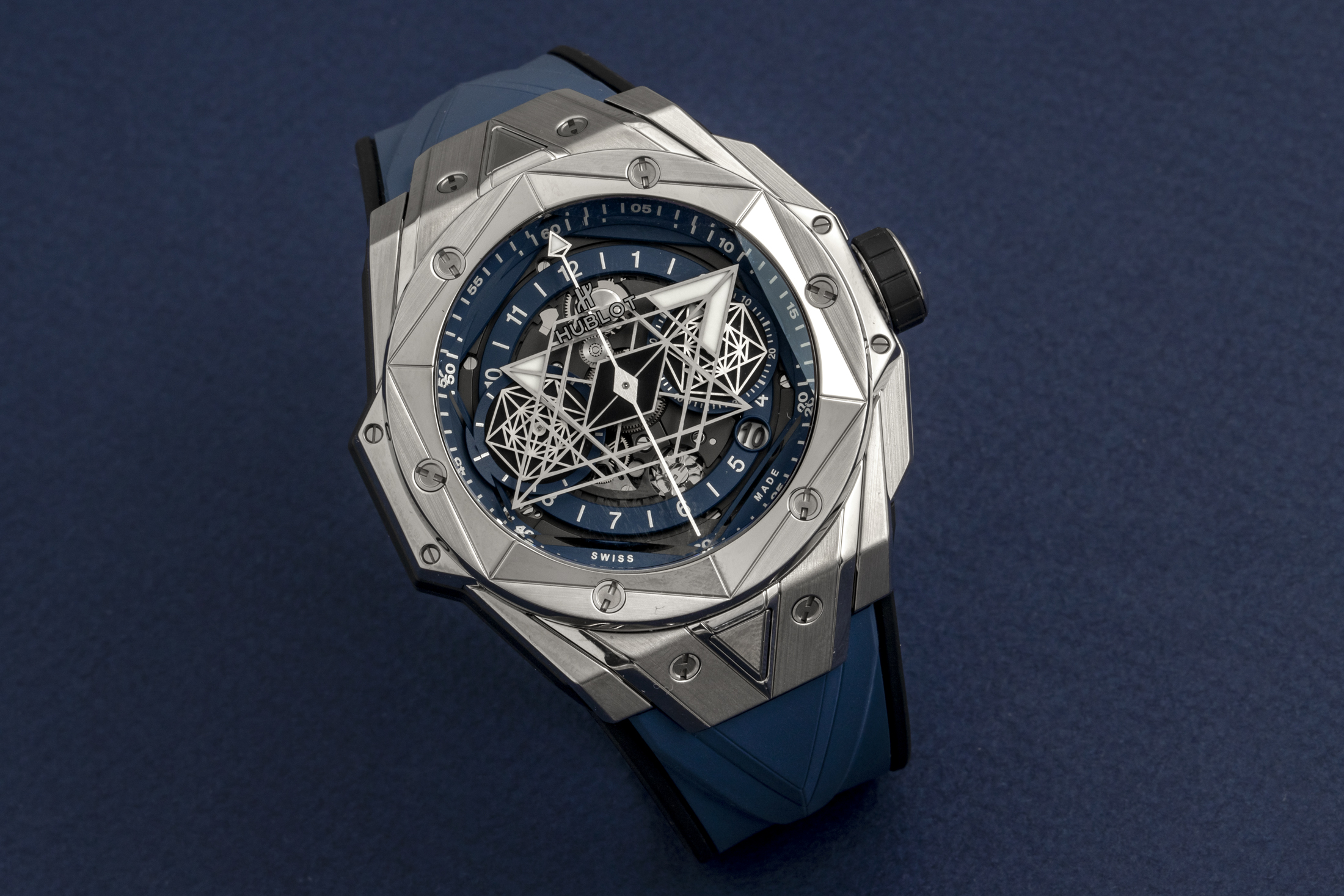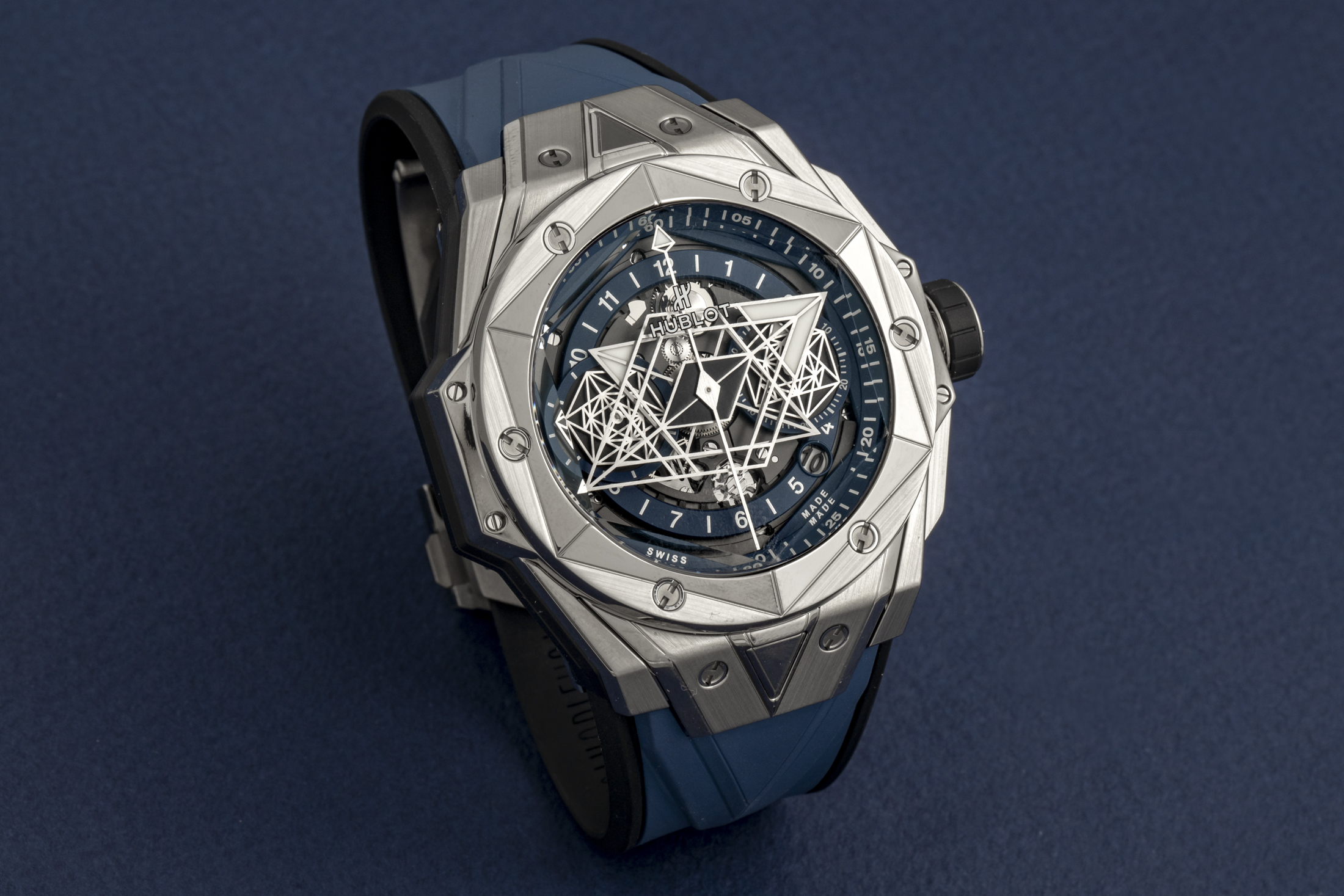 ウブロというブランドは、異なる素材やアイデアの融合を体現し、現在の製品ラインナップにはテーマ性の強いビジュアル・アイデンティティが見られ、多くのモデルでは、同じように顕著なデザインの特徴を表現している。そのウブロとサンブルーのコラボレーションは注目に値するのだ。
