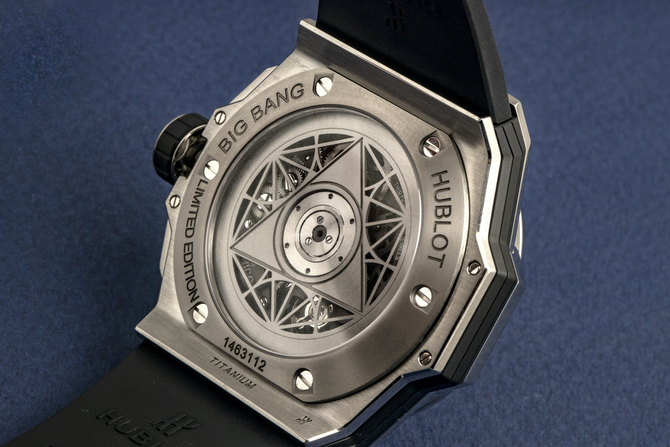 文字盤の一部から素材を取り除き、HUB1240の上に配されたクロノグラフモジュールの露出部分上にクロノグラフ針が浮かんでいるように見えるが、「針」はむしろ格子状の円盤のようになっており、針とケースのモチーフを反映している。ローターもこのやり方を踏襲。また、クロノグラフディスクの上には、目印となる三角形の夜光が塗布されている。