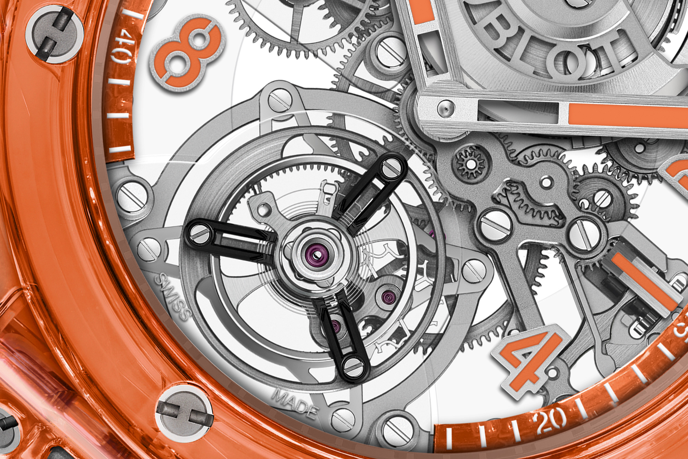 横45mm、厚さが15.3mmある半透明なサファイアケースのこのウブロは、小さなオレンジというよりも艦艇のようなサイズ感だが、幾分野性的な感じがして、このモデルの美学は非常に成功していると思う。オレンジの鮮やかさが、サテン仕上げとサンドブラスト加工が施されたムーブメントのインダストリアルな雰囲気と見事にマッチ。さらに、ダイヤルとムーブメントの構造を支える3つのサファイアブリッジが、トゥールビヨンと巧みな巻き上げローターに視線を引きつけながら、内部を明るく開放的に見せてくれている。