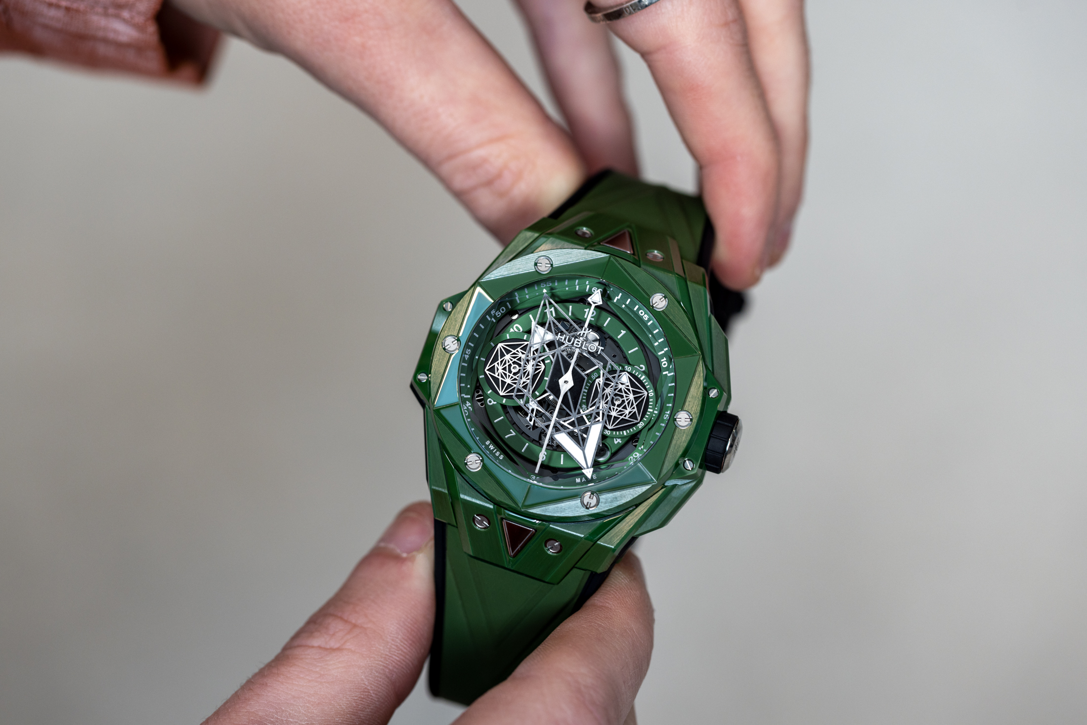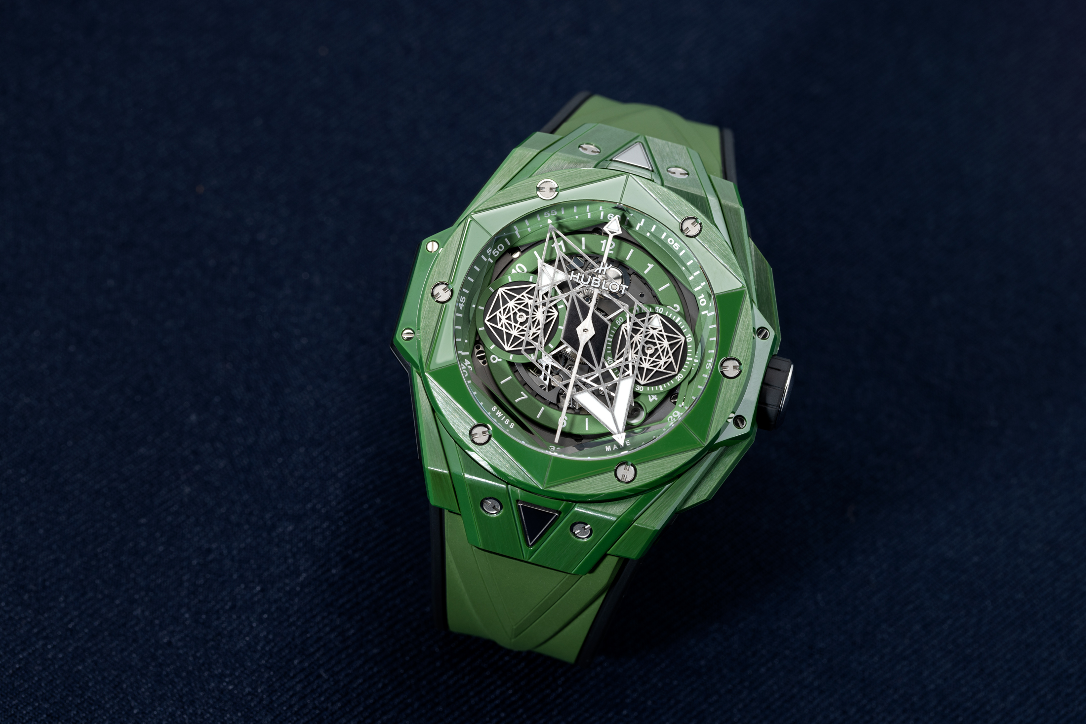 スイス人タトゥーアーティスト、マキシム・プレシア-ビュシ(Maxime Plescia-Büchi)氏が率いるクリエイティブ&デザインスタジオ、サンブルー(Sang Bleu)とウブロのパートナーシップは、今年で7年目を迎える。これを記念して、プレシア-ビュシ氏がデザインした傷の付きにくいウブロ ビッグ・バン サンブルー IIの3本が発表された。彼の幾何学的なタトゥーやアートワークを見たことがある人なら、この時計を見てすべての関連性を見抜くことができるかもしれない。