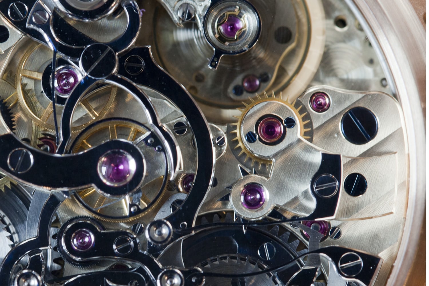 Cal.L1902ムーブメントには876点の部品が搭載されており、そのうち67点は貴石で占められています。パワーリザーブは、ムーブメントの計時部分は30時間ですが、ソヌリには24時間分のチャイムを一度に鳴らすのに十分なパワーを蓄積できる専用香箱があります。最後にクロノグラフ用の3つめの香箱がありますが、スプリット機構とフドロワイヤント機構には大きなパワーを消費します。3つの香箱は全てメインリューズから巻かれており、12時方向に巻くと計時とクロノグラフの香箱に、6時方向に巻くとソヌリ/リピーターの香箱に動力が蓄えられます。このプロトタイプで撮影したCal.L1902には、まだ最終仕上げが済んでいませんでしたので、その点はご留意いただきたいと思います。