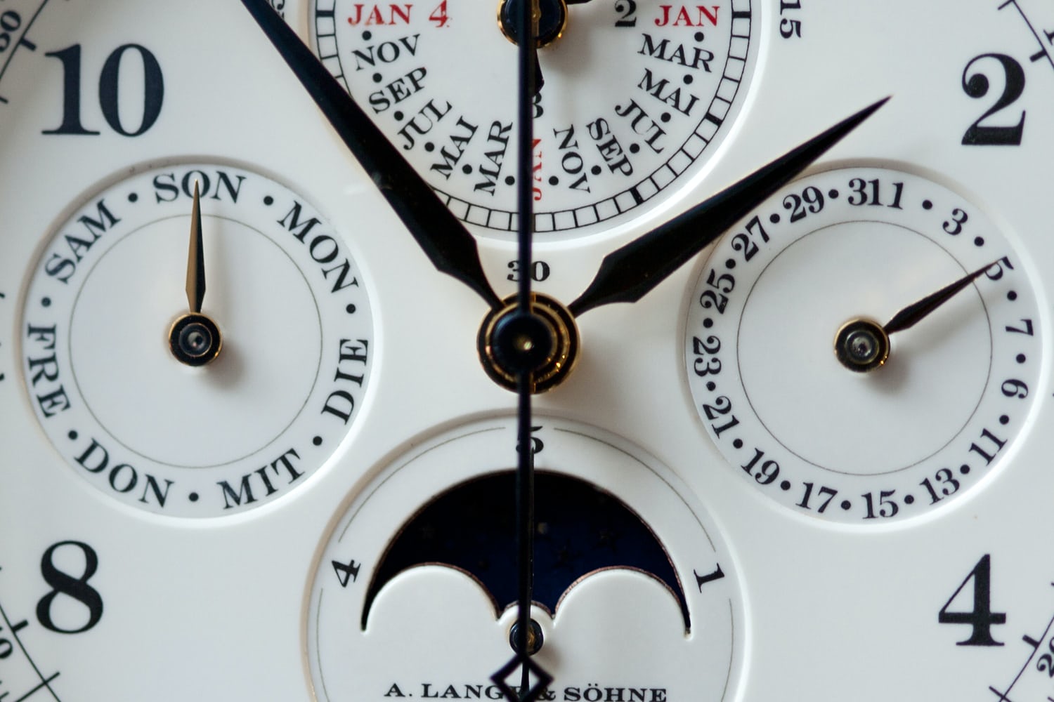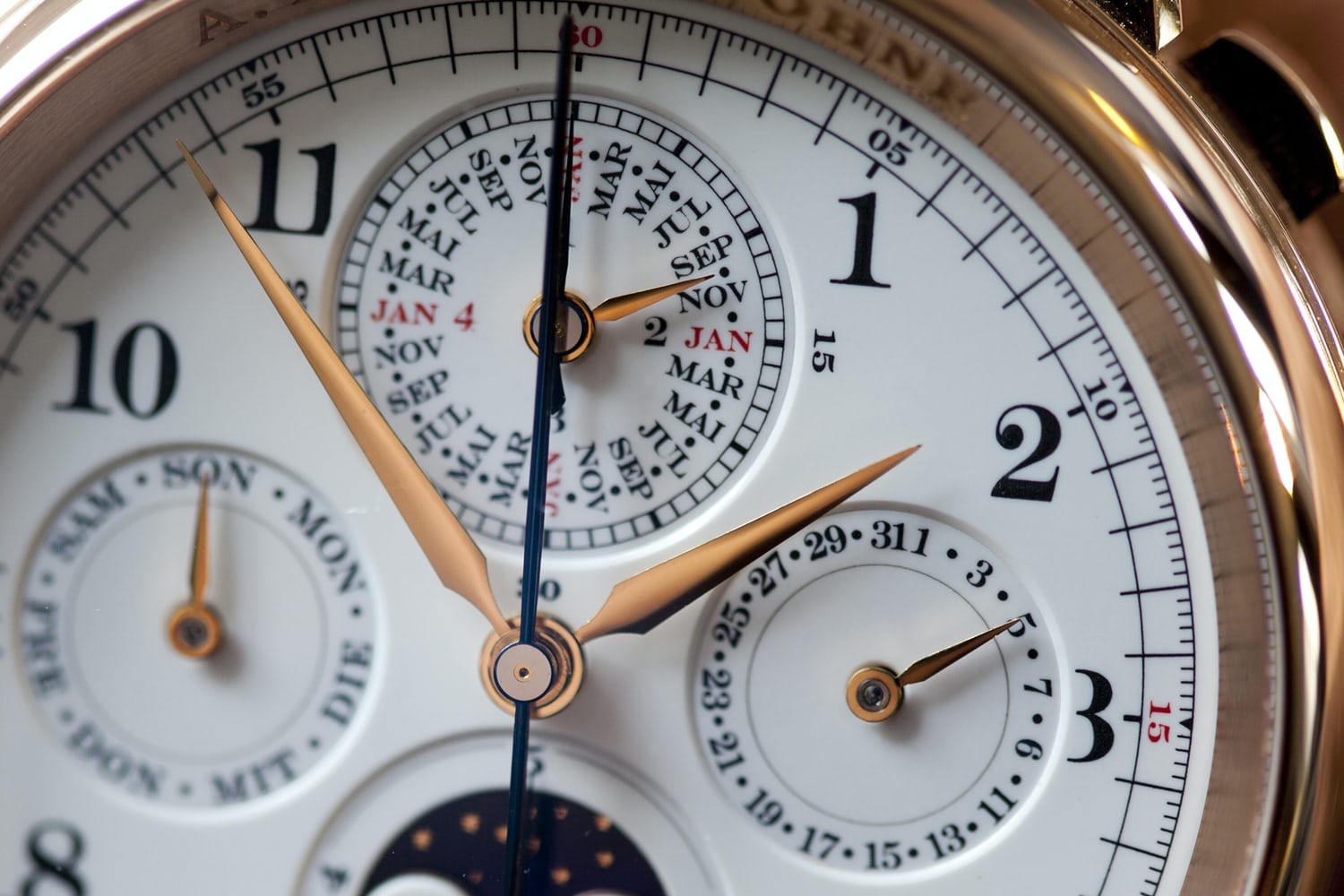 まずは永久カレンダーから。ランゲはこれまでにも永久カレンダーを製作してきましたが(ラトラパンテ・パーペチュアルも含め)、今回のモデルでは、非常に細かく調整された複雑機構が採用されています。これまでのモデルとは異なるのは、表示方式です。12時位置のインダイヤルには、4年分の月と閏年表示が全て表示され、左側には曜日、右側には日付を表示。6時位置にはムーンフェイズがあり、フライングセコンドの下部に組み込まれています。