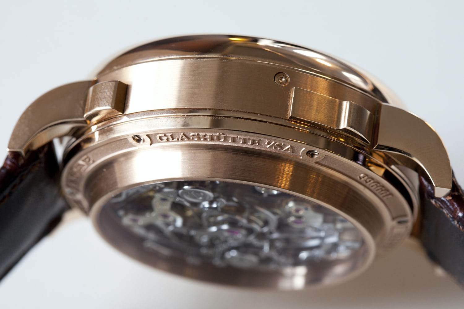 新しいランゲのミニッツリピーター機構に不満があるとすれば、その機構が全く見えないことです。これはドイツの伝統的な時計製造技術にも当てはまりますが、ここではあまり魅力を感じられません。ハンマーとゴングは他のムーブメントの下に隠されているため、裏返したときにハンマーがゴングを叩く様子を視覚的に楽しむことができないのです。繰り返しになりますが、なぜこのような選択がなされたのかは理解できますが、ちょっと納得できない部分でもあります。