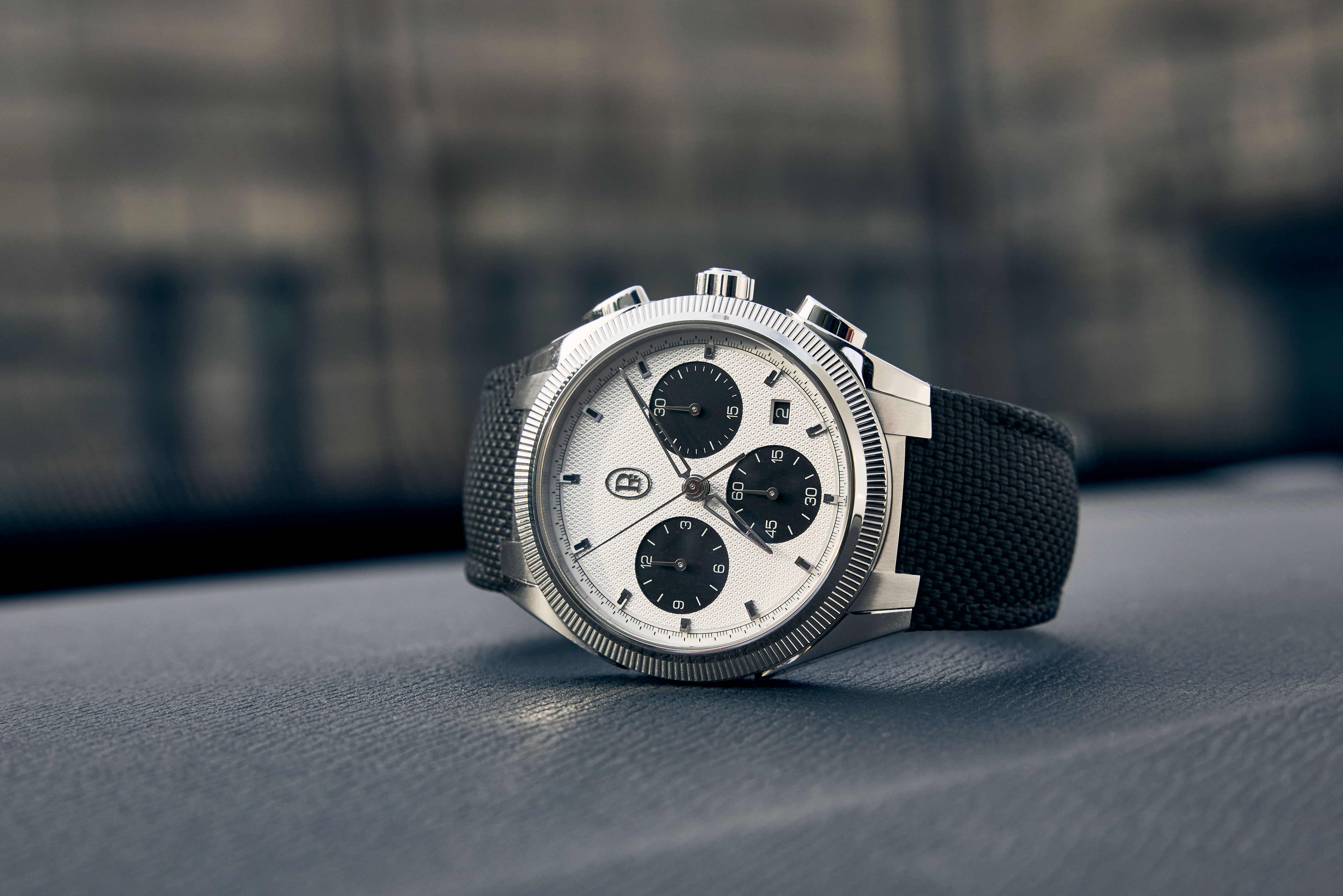 もちろん、こだわりはデザイン面にも及ぶ。ディテールは上記トンダ PF スポーツの3針モデルに準ずるが、スポーティな雰囲気を強めるためにダイヤルはクロノグラフの定番である“パンダダイヤル”を採用した。トンダ PFの既存モデルにはミラノブルーやグレーなどニュアンスを楽しむ色が多かったが、トンダ PF スポーツでは3針、クロノグラフともにしっかりメリハリを利かせた配色とすることでコンセプトを強固に補完している。