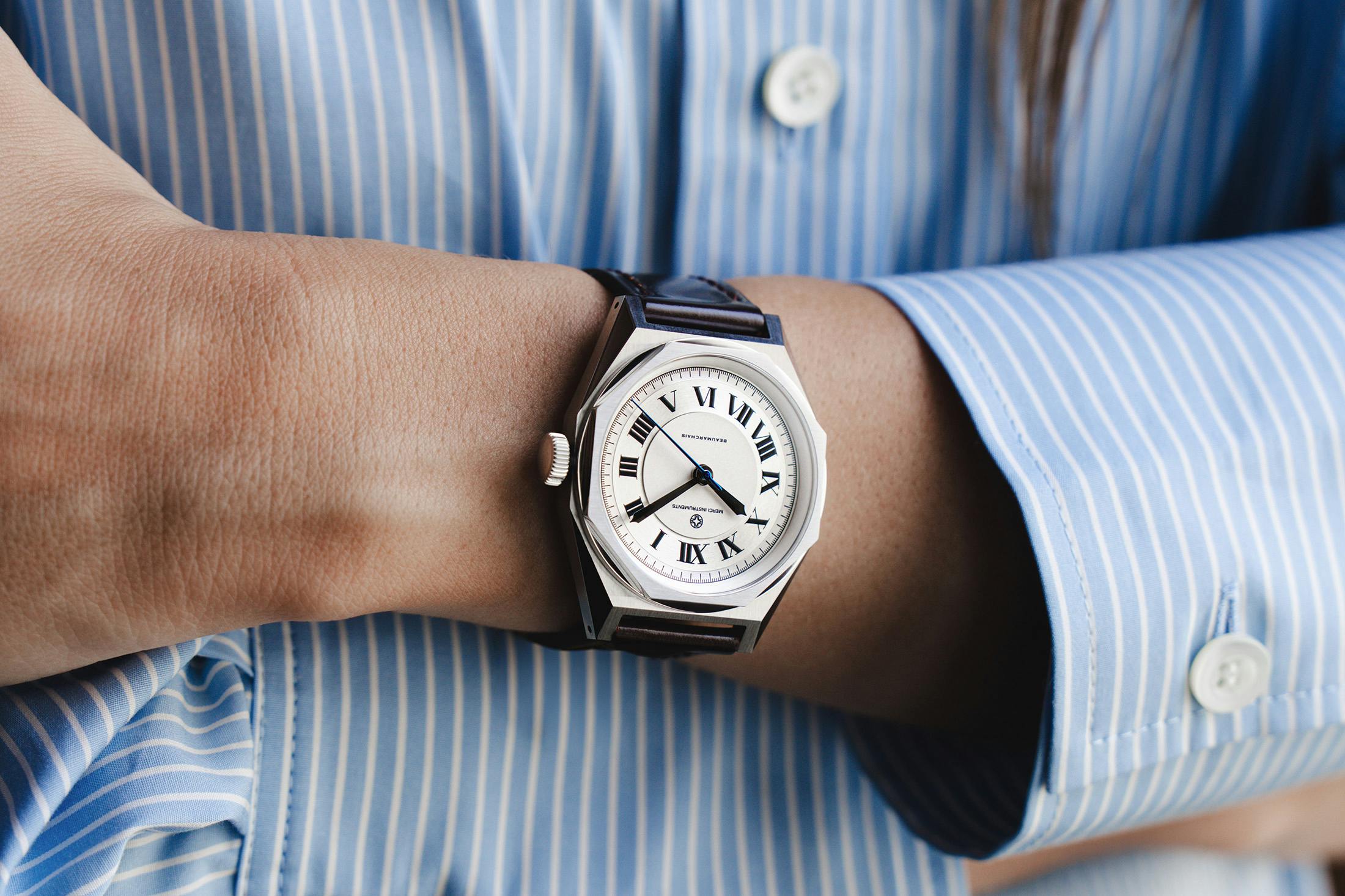 我々のお気に入りの良心的なブランドのひとつ、パリを拠点とするメルシーが、ボーマルシェコレクションと名付けた6つの新作を発表した。そのフォルムには見覚えがあるかもしれない。おそらく、彼らと我々のコラボモデル、メルシー インストゥルメンツ ボーマルシェ H02 リミテッドエディション FOR HODINKEEでご覧になったことがあるだろう。今回、1970年代のデザインに着想を得た、きわめて幾何学的なクッションケースが、ウォッチメイキングの歴史に残る象徴的なダイヤルデザインをいくつか取り入れたカプセルコレクションとして復活を遂げた。ステリーナダイヤル、バックリーダイヤルなど、この新作にはあらゆる要素が少しずつ取り入れられており、ブランドによれば古代ローマ、ギリシャ、エジプト文明にも敬意を表しているという。