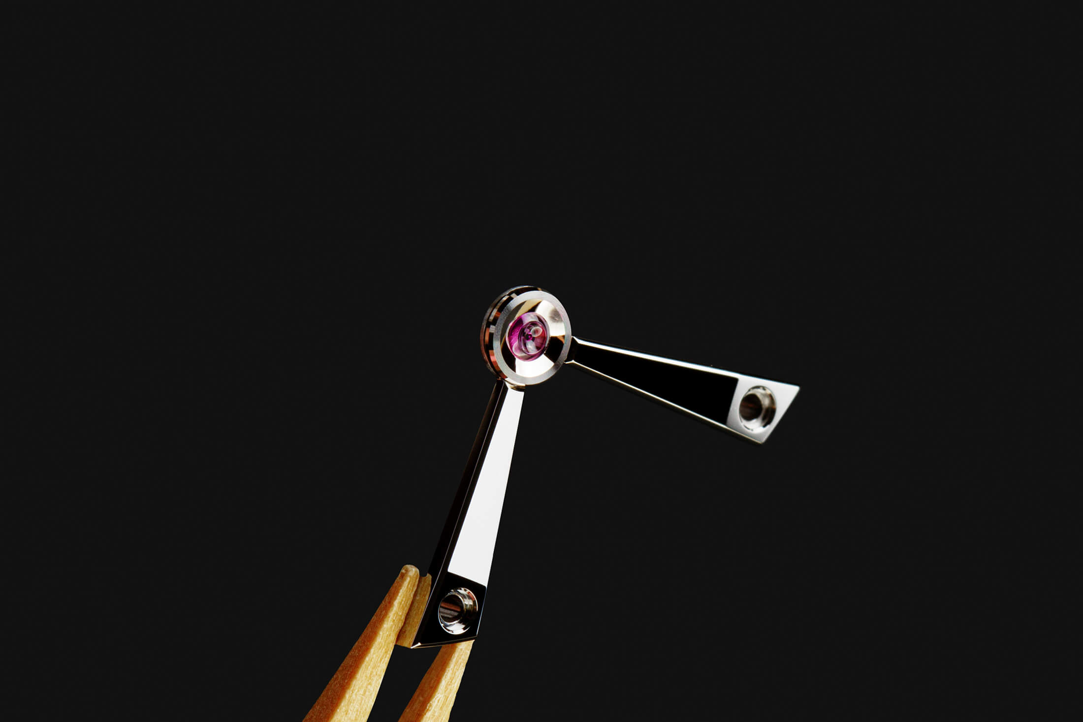 Cal.FB-T.FC-RSは、香箱と逆回転フュゼの両方を吊り下げ式(片側のみ固定)とし、特許も取得したピラータイプ構造が特徴。また、パワーリザーブインジケーターは10時位置に設けられているが、ケースバック側から見える吊り下げ式の円錐台が、香箱に連結したアーバー(テーパーのついた金属の棒)に沿って上下。先端にルビーの付いたモビールアーム形状のフィーラースピンドルが円錐上にあり、その位置により香箱の巻き上げ状態を反映。フラットレバーと螺旋バネを介して、ダイヤル側のパワーリザーブインジケーターに情報が伝達される。