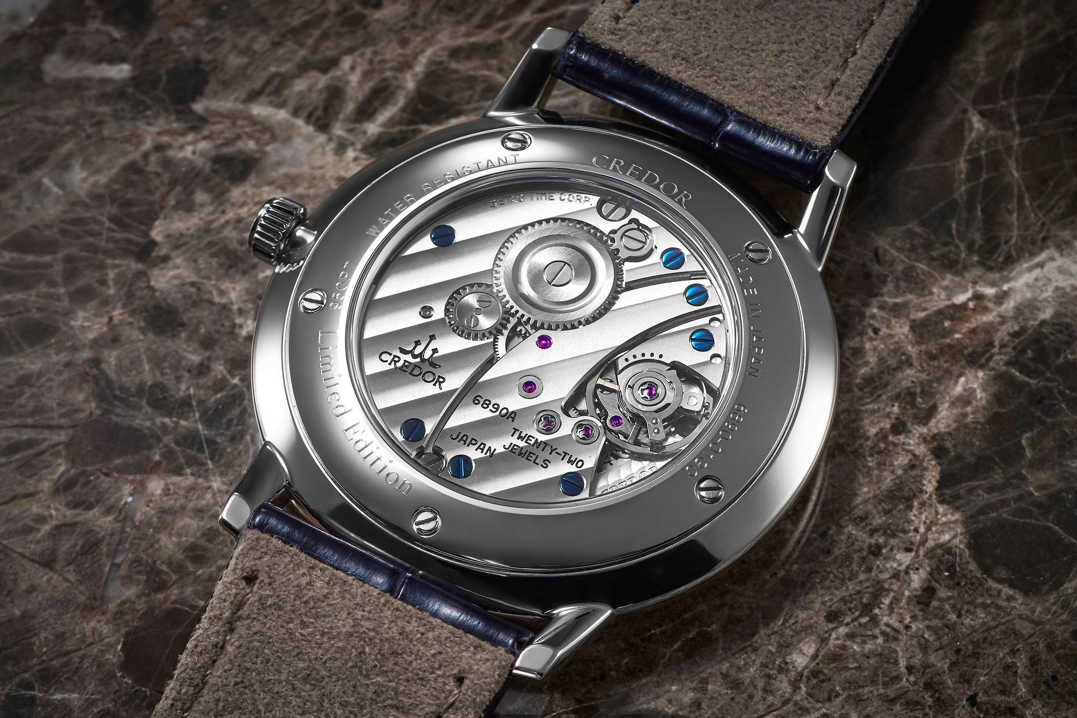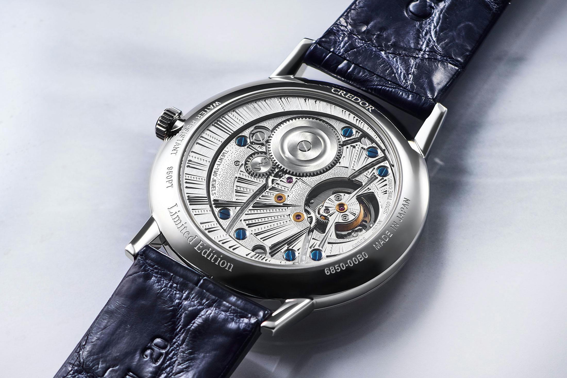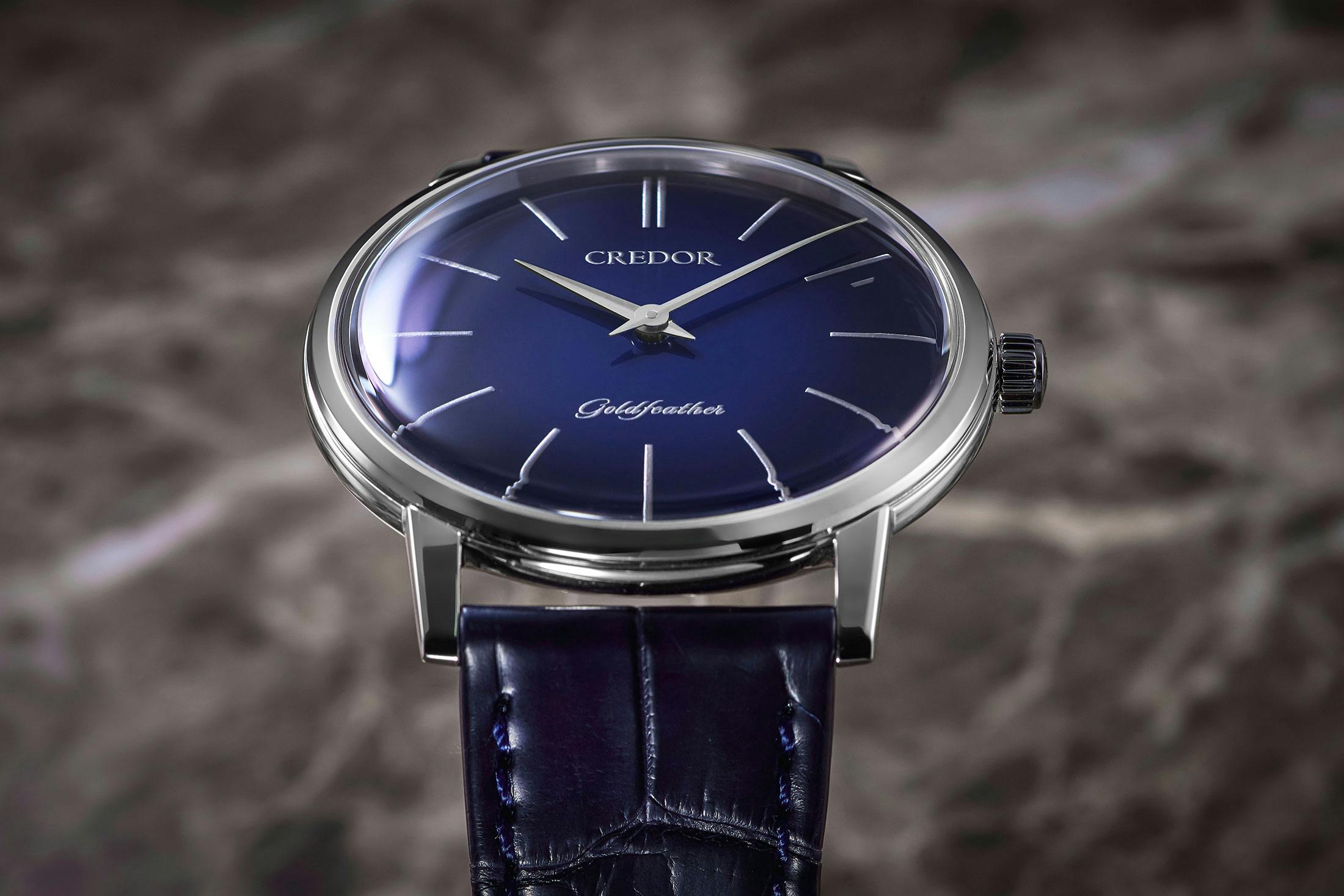 緩やかな曲面を描くダイヤルに漆を均一に塗り重ね、研ぎ上げる工程は、熟練の匠の指先の感覚と精緻な角度調整が不可欠だ。インデックスや“CREDOR”、“Goldfeather”のロゴは、非常に硬質で加工が難しいプラチナ粉を用いた高蒔絵(たかまきえ)で描かれており、深い青の漆ダイヤルと美しいコントラストを織りなしている。ケース径37.4mm、厚さわずか8.1mmのPt950ケースには、信頼性の高い手巻きメカニカルムーブメントことCal.6890が搭載されている。クレドールが追求する繊細な美しさ、審美性がダイヤルに見事に表現されたこのモデルは、550万円(税込)で販売され、世界限定25本(うち国内15本)が用意される。