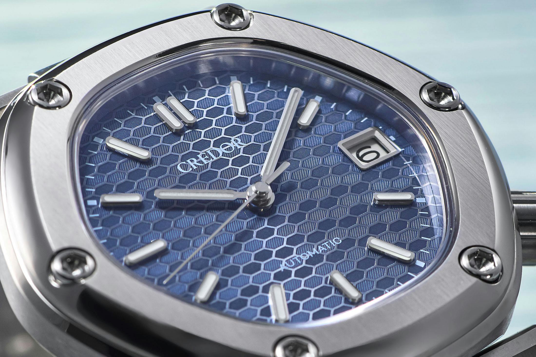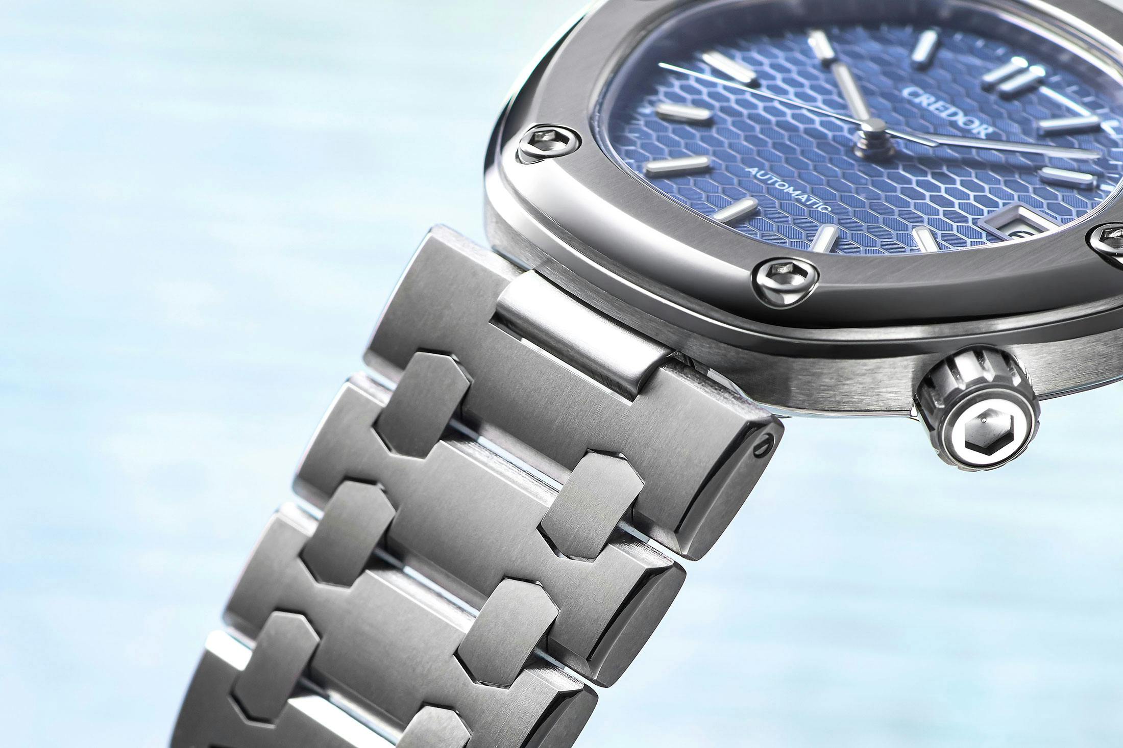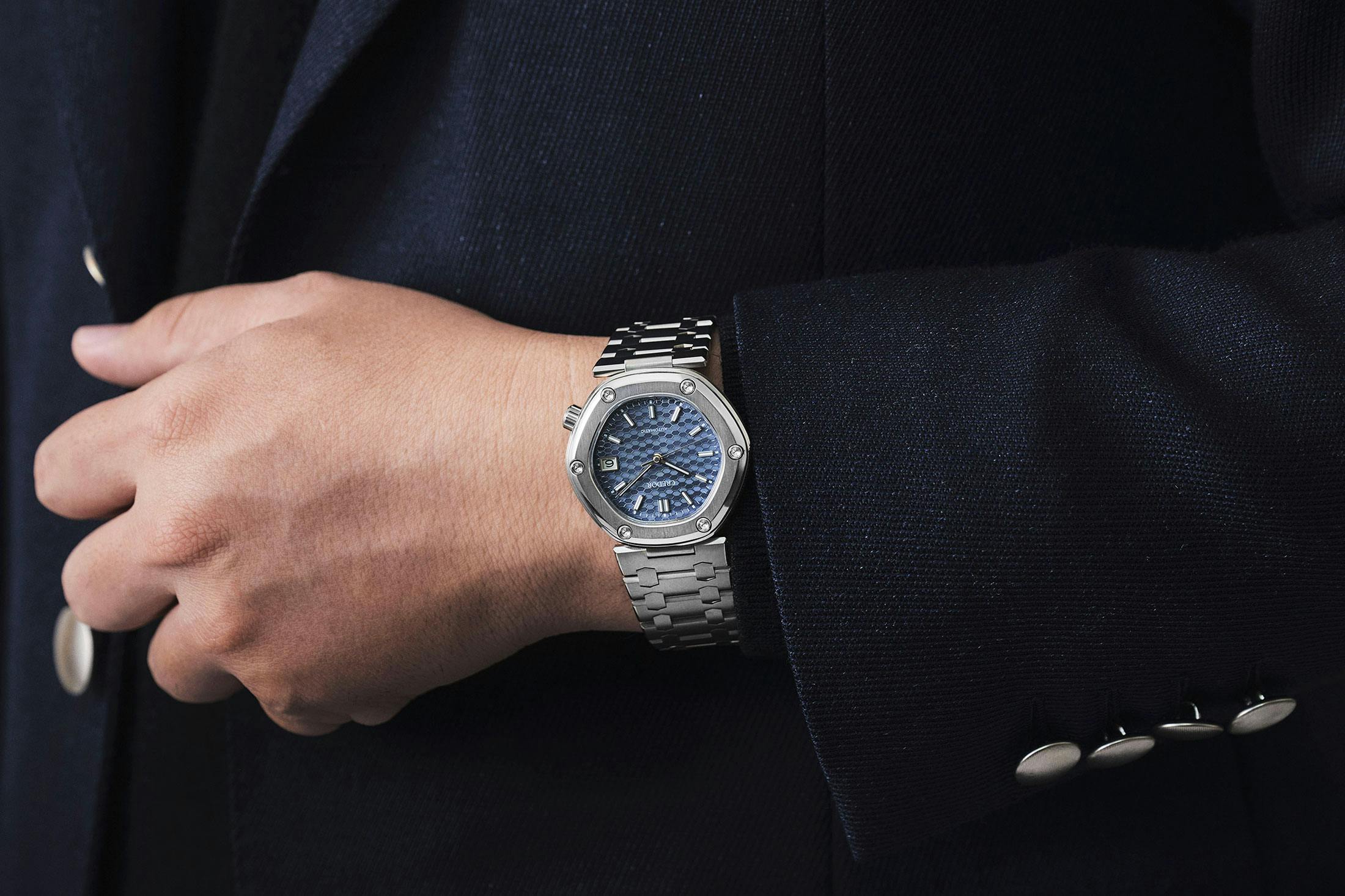 本作はDawn Blue(ドーンブルー)をテーマに、夜明けの空を思わせるブルーグレーのダイヤルを採用。ジェンタによってもたらされたDNAであるアイコニックな六角形のベゼルに呼応するように、ダイヤルには複雑な六角形の幾何学模様が施されている。ケースとブレスレットには、ステンレススティールよりも30%軽量で耐傷性・耐食性に優れたブライトチタンを採用。ケース径38.8mmに対し、厚さは8.9mmと非常にエレガントなフォルムを維持している。ムーブメントには専用の薄型自動巻きCal.CR01を搭載し、価格は198万円(税込)となっている。