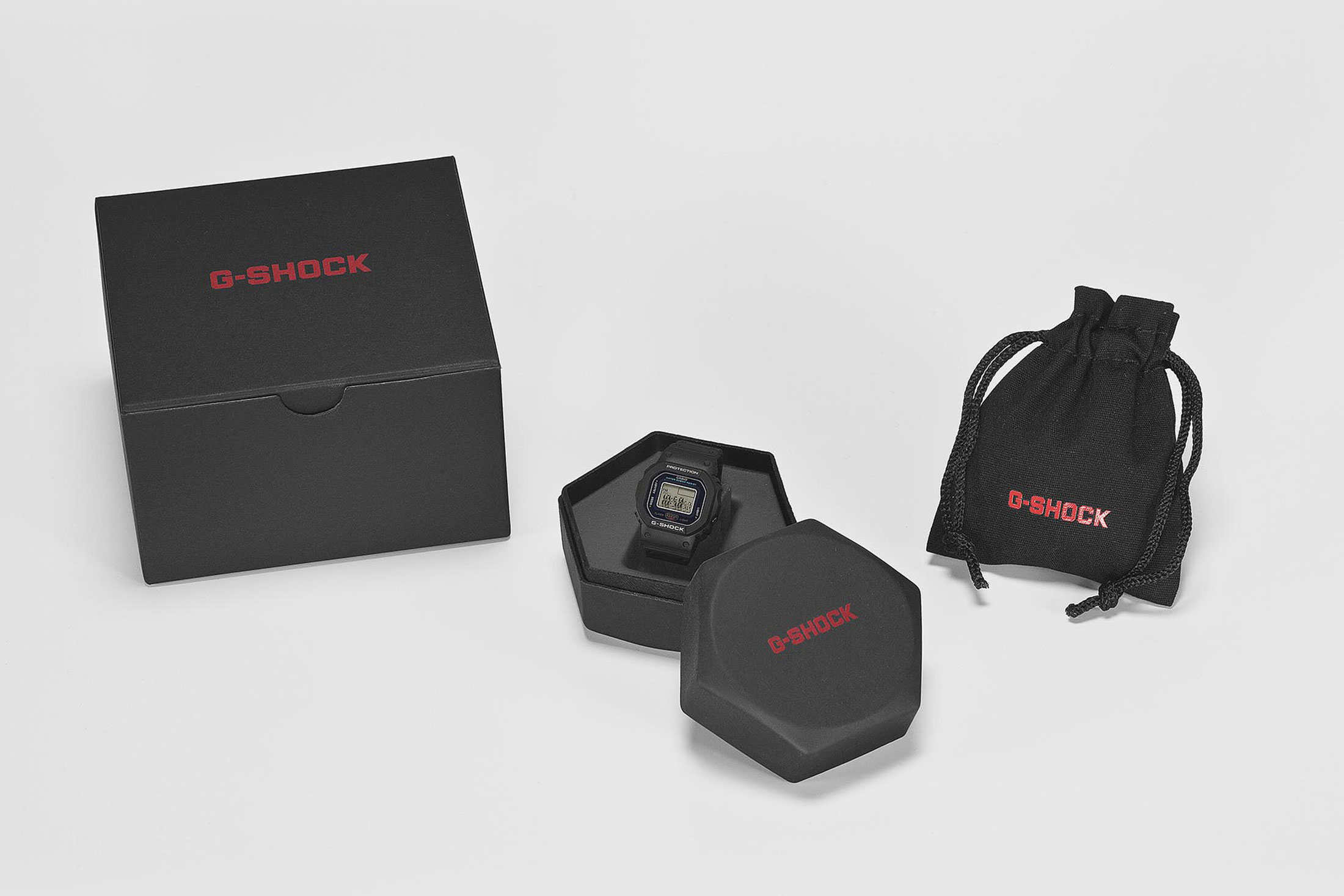 その型番が示すとおり、本作はG-SHOCK ICONIC STYLESのひとつである5600をデザインベースとしている。ORIGINである5000から継承された角型のケースフォルムや液晶まわりの意匠はもちろん、左右にディンプルを施したストラップまでもが樹脂によって忠実に再現されている。