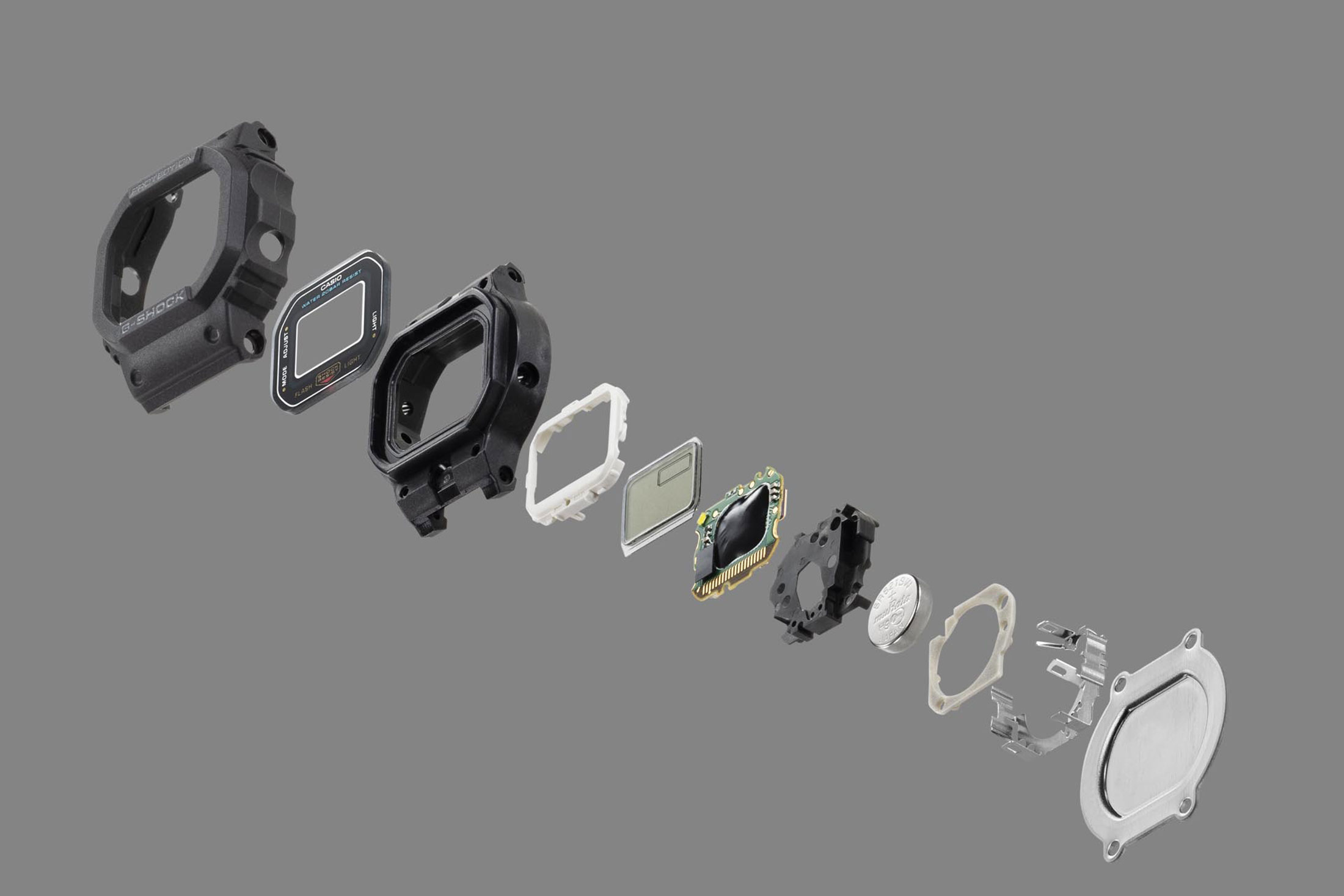 分解図を見るかぎり、今回発表されたDWN-001には、ウォッチ同様にモジュールを保護する樹脂製のインナーケースが内蔵されているようである(素材の詳細は非公開とされている)。これはCRW-001には見られなかった構造であり、製品サイズを考えると、相当繊細な加工技術が求められたのではないかと思われる。