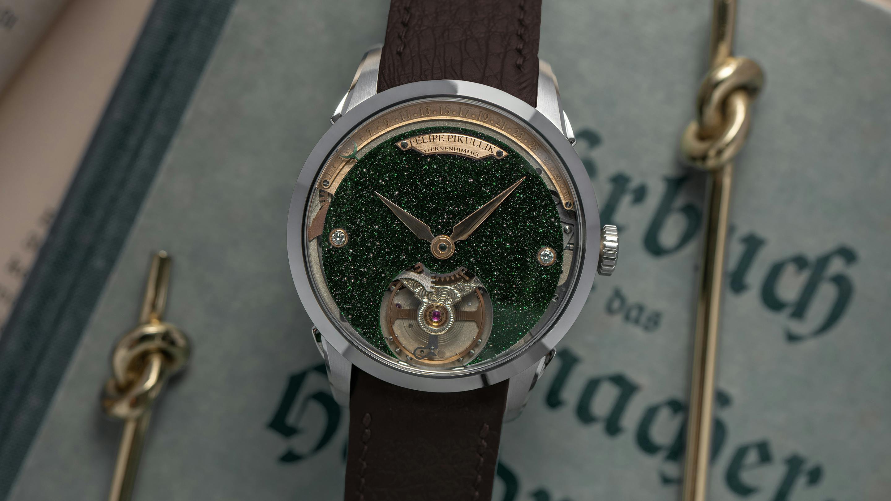 新作のフェリペ・ピクリク シュテルネンヒンメル FPA1は、ETAやユニタスの輪列(ピクリク氏が自社で再現したものではあったが)に依拠していたこれまでのモデルから、さらに一歩踏み込んだものとなっている。彼は自身の名を冠した自社製ムーブメント、Felipe Pikullik Architektur Eins(FPA1)を開発したのだ。まずはダイヤルから見ていこう。直径39mm、厚さ10.5mmで50m防水のステンレススティール製ケースに収められたこの時計は、グリーンまたはブルーのアベンチュリンダイヤルが浮かんでいるかのようなデザインが特徴で、9時と3時位置にはふたつのダイヤモンドがセットされている。アプライド仕様でエングレービングが施されたネームプレート、テンプが見える“オープンハート”スタイル、そして10時から2時位置にかけてのレトログラード式のデイト表示が配されている。