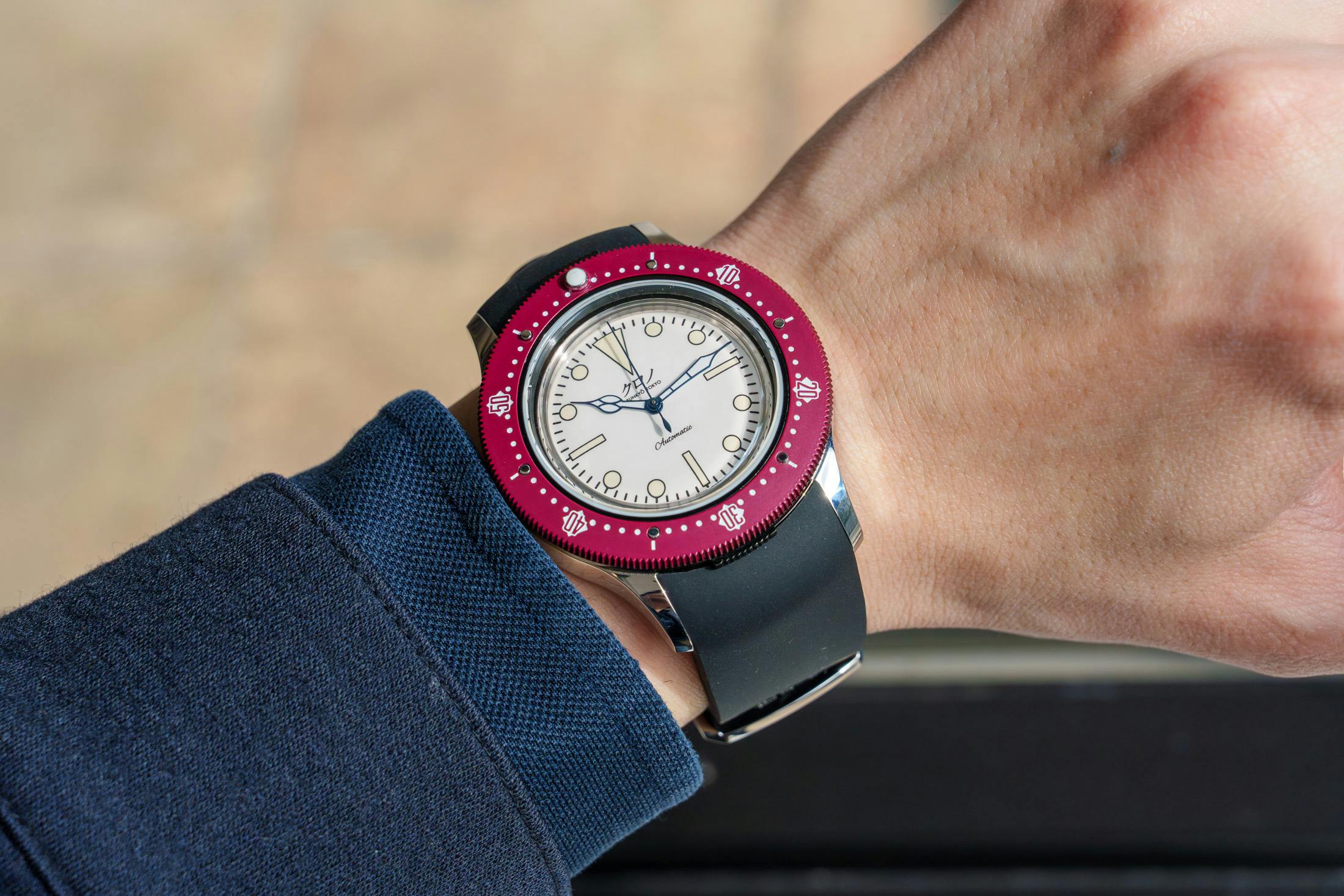 その結果生まれた入れ子構造は、既存のダイバーズウォッチとは異なるアプローチを提示しています。さらにこの時計の面白い点は、ひとつの時計がまったく異なる2つのキャラクターを持っていることです。インナーウォッチは35mmのクラシカルなドレスウォッチですが、ダイバーズケースを装着すると46mmのタフなスポーツウォッチへと変化します。この二面性は非常にユニークで、個人的にはタキシードの下に潜水用のウェットスーツを着込んでいる映画のスパイのようなイメージを連想しました。