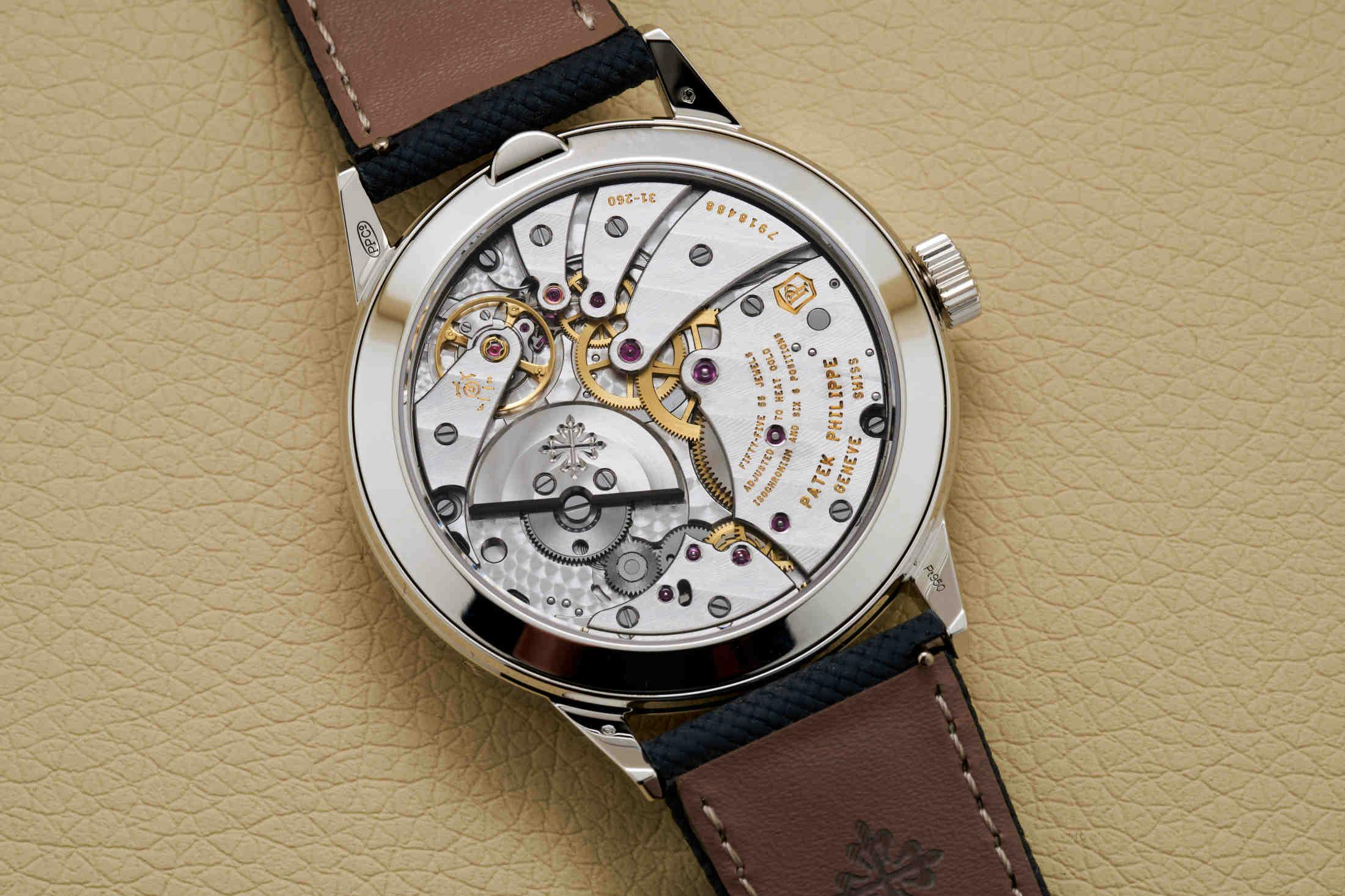 まず5236P インライン永久カレンダーについてだが、直径41.3mm×厚さ11.07mmのプラチナ製ケースに、ムーンフェイズとパーペチュアルカレンダーを備え、48時間パワーリザーブを持つ自動巻きのCal.31-260 PS QLを搭載。そして今回このモデルには、きわめて意外性のあるグレーダイヤルが採用された。
