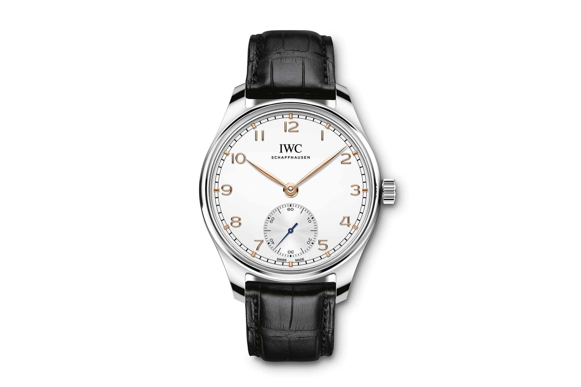 IWC ポルトギーゼ・オートマティック 40 Ref.IW358304。SSケース、シルバーメッキダイヤル、ブルーのアリゲーターストラップ。3気圧防水。ペラトン自動巻き機構、秒針停止機能つきスモールセコンド搭載、60時間パワーリザーブ、31石、2万8800振動/時のIWC自社製Cal.82200を搭載。価格:79万7500円(税込)。詳細は、IWC公式サイトをご覧ください。