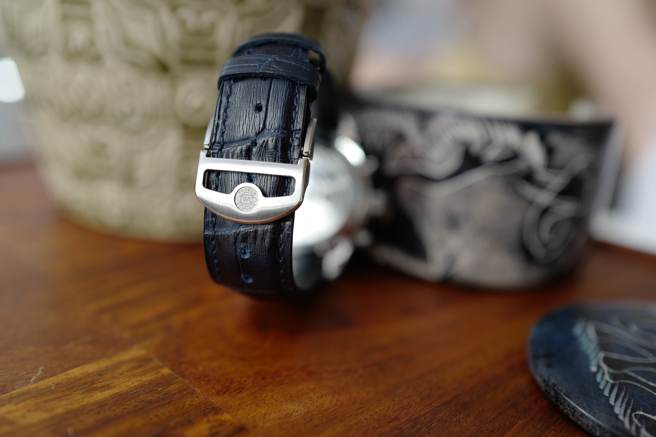 約22年前からそうであったように、この時計はレザーストラップ仕様である(最近のアップデートでは、そこにも変化が見られた)。私が着用する機会を得たバージョンは、ダイヤル上のブルーのアクセントにマッチした同色のアリゲーターレザーストラップが装着される。ストラップ自体は、私がこの時計に抱く不満の1つである両開き式ディプロワイヤントバックルが付属する。私にとって時計は身体の一部であり、意識する必要のない存在なのだ。逆に、時計を外したり、眺めたり、リューズを回したり、1日の様々な時間帯に大きな楽しみを得ている。時計は愛着の対象であり、私はかなりの愛を時計に注いでいる。しかし、クラスプは自然に開閉できるべきだ。車輪を再発明する必要がないのと同じように。このクラスプは、両開き式ディプロワイヤントであるため、時計を身に着け、または外すために2段階の開閉が要求される。片方のクラスプが開くと、もう片方も同様に開放する必要があることが、わかりにくかった(私はこの機構を理解しようとしてロダンの彫刻のように5分程固まってしまった)。クラスプ機能でまごついたのはさておき、クラスプは閉じたときに手首にしっかりと固定され、装着感に優れていることは付け加えておこう。