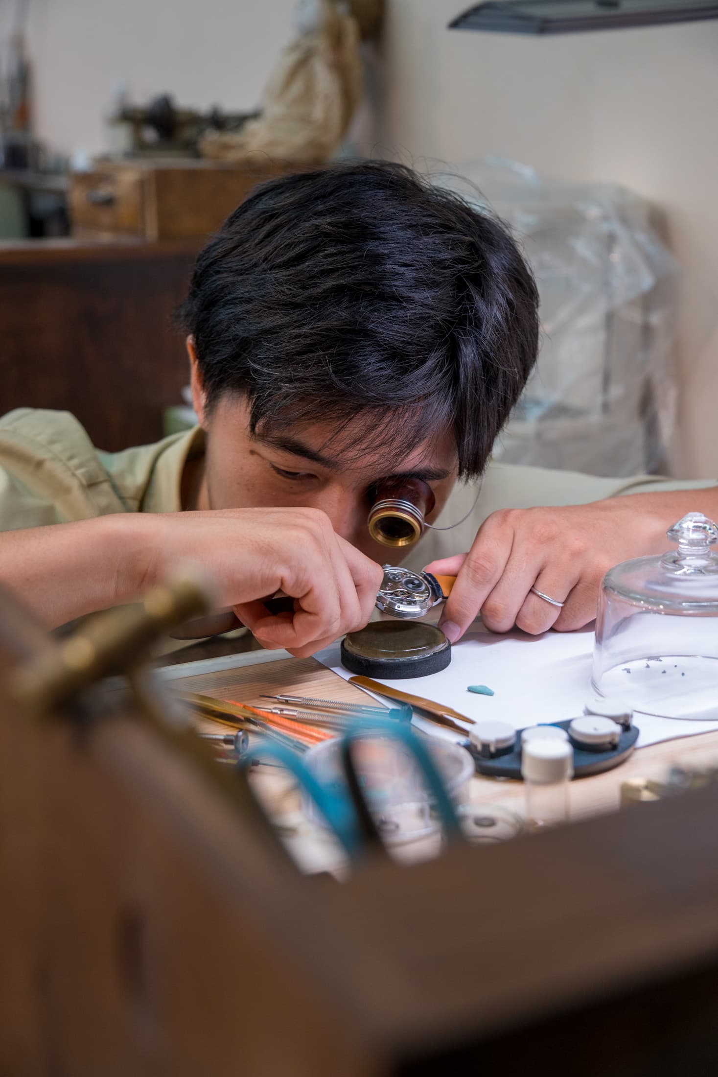 今回のオークションで販売されるマサズパスタイムのもうひとつの作品は、マーク・チョー(Mark Cho)氏が特注したリピーターウォッチです。チョー氏は、クラシックメンズウェアショップ アーモリー(The Armoury)の共同設立者であり、英国のタイメーカー ドレイクス(Drake's)の共同オーナーとしても知られる人物で、熱心な時計愛好家でもあります。幸運にも僕はこのプロジェクトの進行中にチョー氏とともにマサズ パスタイムを訪れ、彼に話を聞くことができました。